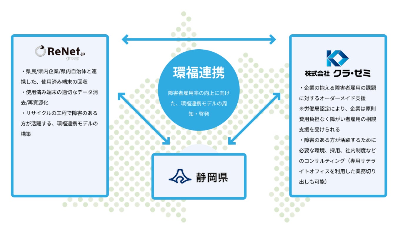 「県民・企業・自治体の使用済みパソコンの適正処分(都市鉱山の掘り起こし) 」と、「そのリサイクルに県内在住の障がい者が参画できる仕組み」を掛け合わせることで、資源の有効活用と障がい者雇用を企業規模に関わらず叶えるのが、環福連携モデルです。静岡県が障がい者雇用率向上に向けた啓発活動、リネットジャパンが環境分野、クラ・ゼミが福祉分野を担うことで、地産地消型の環福連携を実現します。
