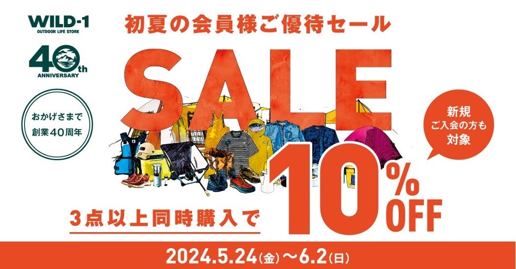 1984年4月21日に産声を上げたWILD-1は、創業40周年を迎えました。これまでのご支援に感謝し、今年4~5月に続く記念セールの第2弾を実施します。キャンプ、フィッシング、トレッキング用品など40周年を記念した特別な商品を多数ご用意したほか、期間中、WILD-1会員様および新規にご入会いただいた方を対象に、店内商品どれでも3点以上を同時購入でそれぞれ10%割引いたします。また、セール期間中に新規会員登録いただいた方にはもれなく 100 ポイントをプレゼントする「WILD-1メンバーズ 新規入会&ご登録キャンペーン」も同時開催します(※特典ポイントは6月26日に付与予定)。