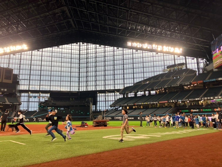今回初実施の当コンテンツには、小学生とその保護者が4人1チーム一組でエントリーできます。エスコンフィールドのダイヤモンドベースを走れるチャンス!バッターボックスからスタートし、ファースト→セカンド→サード→ホームへ、リレー形式で走ってもらいます。