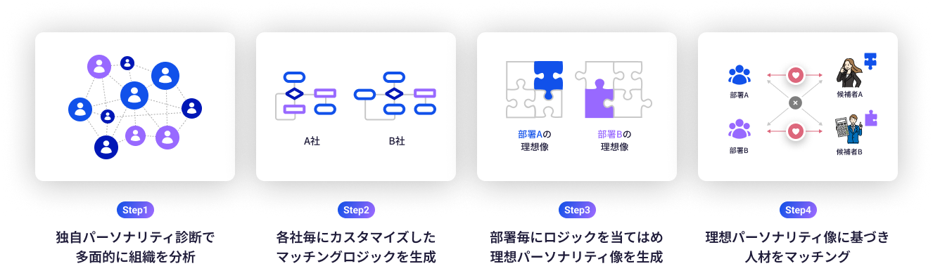 「パーソナリティ分析&マッチング技術」は、「パーソナリティ分析技術※1」と「マッチング技術※2」の2つの技術によって構成されており、独自に開発したパーソナリティ診断で得た個々人のパーソナリティ・データ※3を集合値化し、部署及びチームなどの組織としてのパーソナリティを解明することで、部署及びチームの成長を促す際に不可欠なパーソナリティを持つ人材の配置や採用を行う上での判断材料を提供する技術となります。