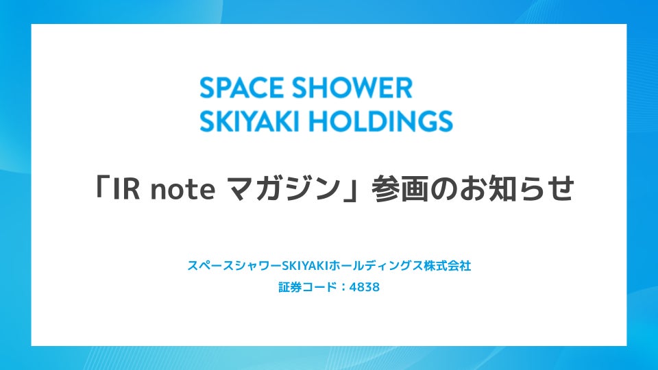 スペースシャワーSKIYAKIホールディングス株式会社(本社:東京都港区、代表取締役共同社長:林 吉人・小久保 知洋、以下「スペースシャワーSKIYAKI HD」)は、2024年8月20日、メディアプラットフォームnoteにて、下記「IR note マガジン」に参画しましたのでお知らせいたします。