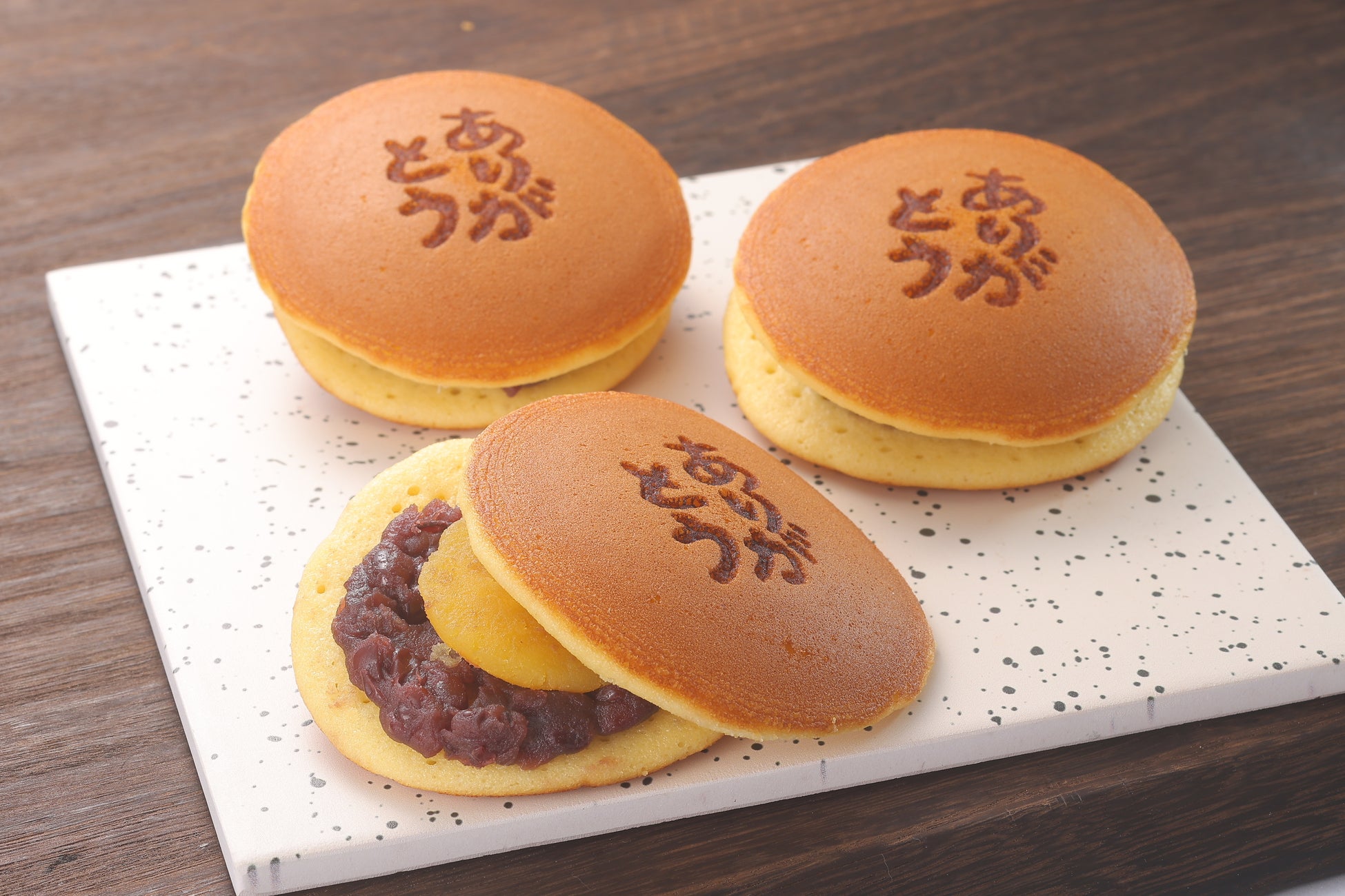 紅あずまを使用した自家製のお芋餡と自家製餡をふわふわパンケーキ生地でサンドした洋風どら焼きです。75周年の感謝を込めて「ありがとう」の焼き印をひとつひとつ手作業で押しました。