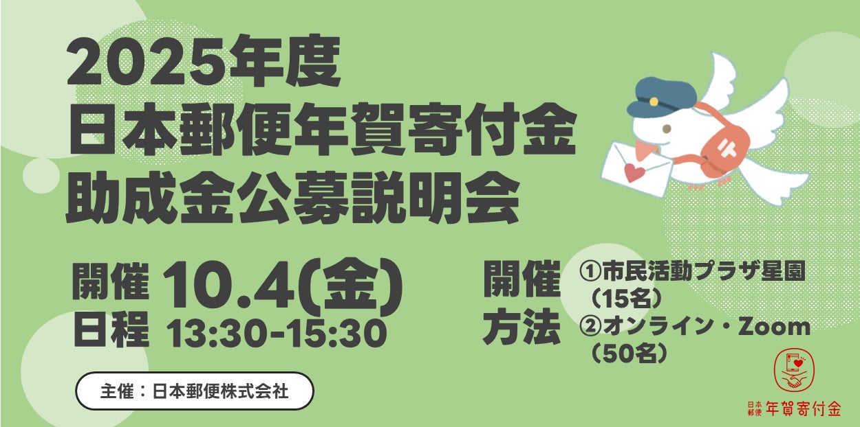 2025年度の日本郵便「年賀寄付金助成」の公募説明会を開催します。年賀寄付金事務局担当の方をお迎えして、助成金の趣旨や、今年の公募の特徴などをお話しいただきます。参加費は無料です。