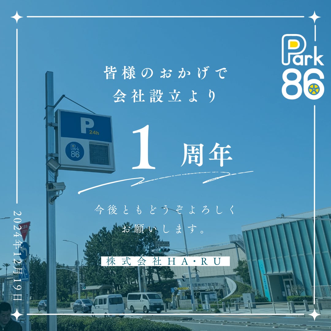 コインパーキング「パーク86(ハチジュウロク)」の運営・管理を行う株式会社HA・RU(本社:東京都渋谷区、代表取締役CEO:井上 勝)は、この度、会社の設立より1周年を迎えることができたことを心よりお知らせいたします。関係各位の皆様のご愛顧に感謝し、今後も更なる成長を目指してまいります。