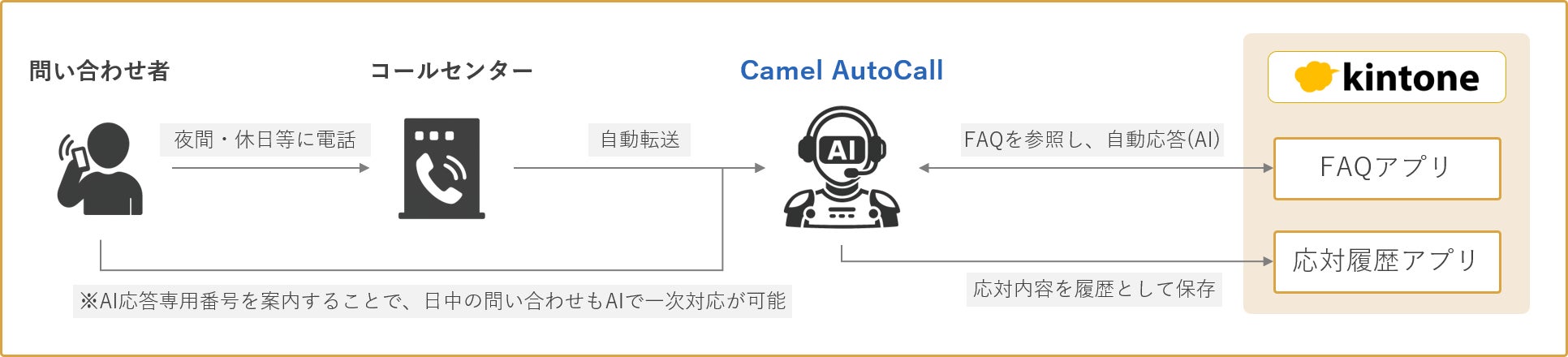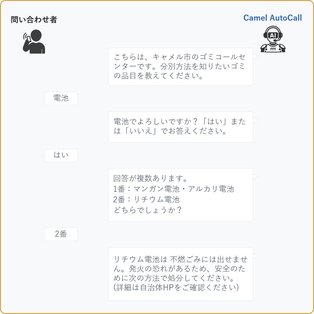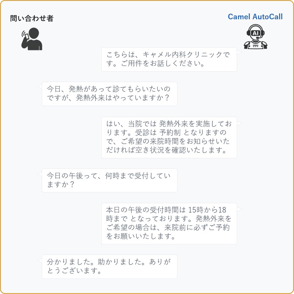 問い合わせ内容は学習済みFAQや案内文を参照し、Camel AutoCall が最適な回答を返します。