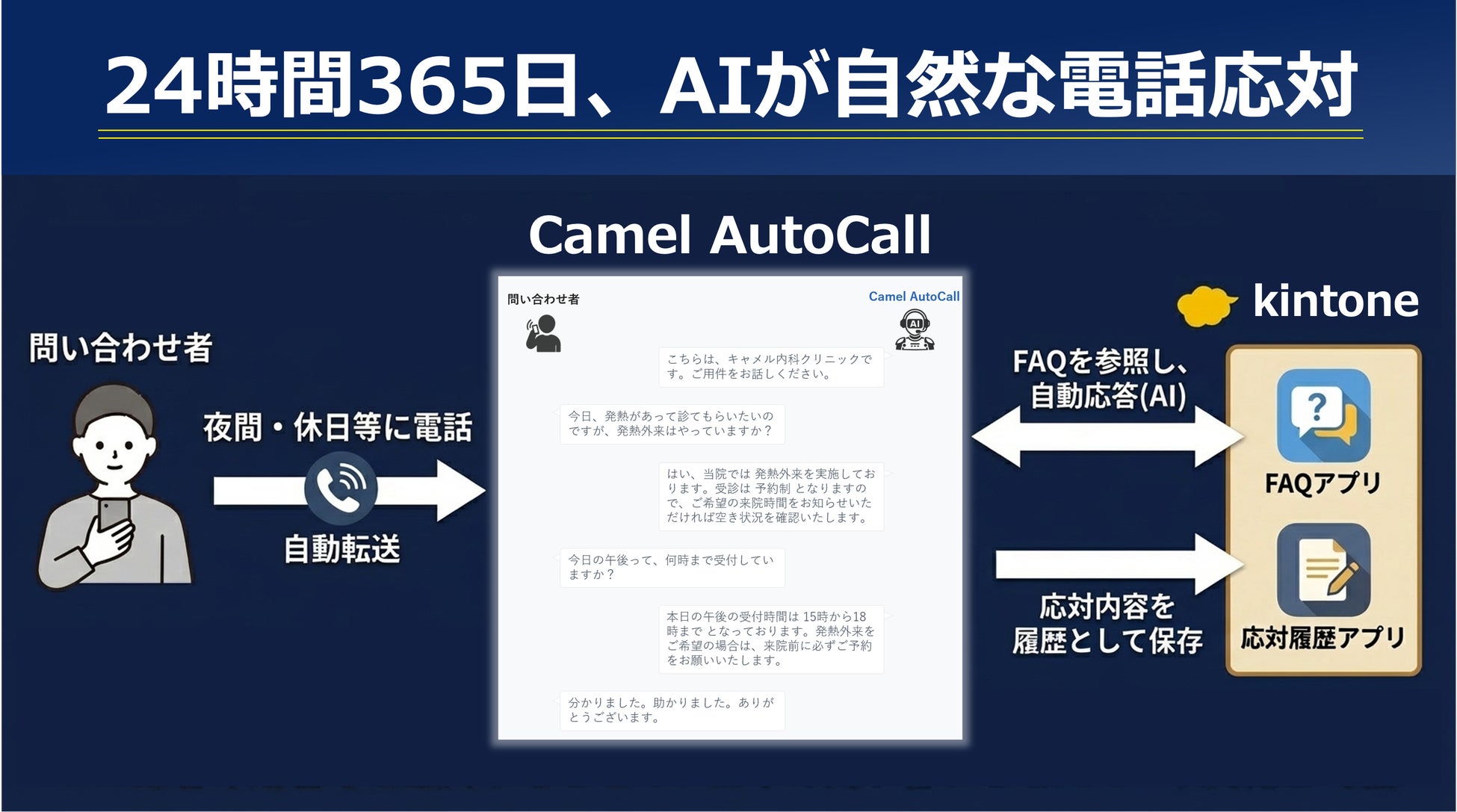 株式会社キャメルテクノロジー(本社:東京都世田谷区、代表取締役:松岡遼馬)は、AIが24時間365日、自動で電話問い合わせに応答するシステム「Camel AutoCall(キャメル オートコール)」 を正式リリースいたしました。