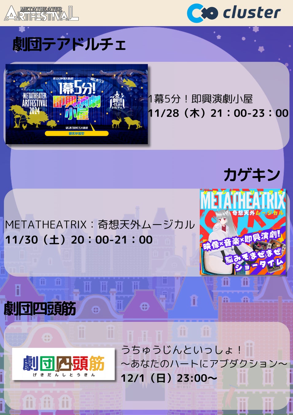 今年は、国産プラットフォーム「cluster」でも開催します。clusterでは劇団テアドルチェ、劇団四頭筋、カゲキンズの3団体によるパフォーマンスが決定しています。