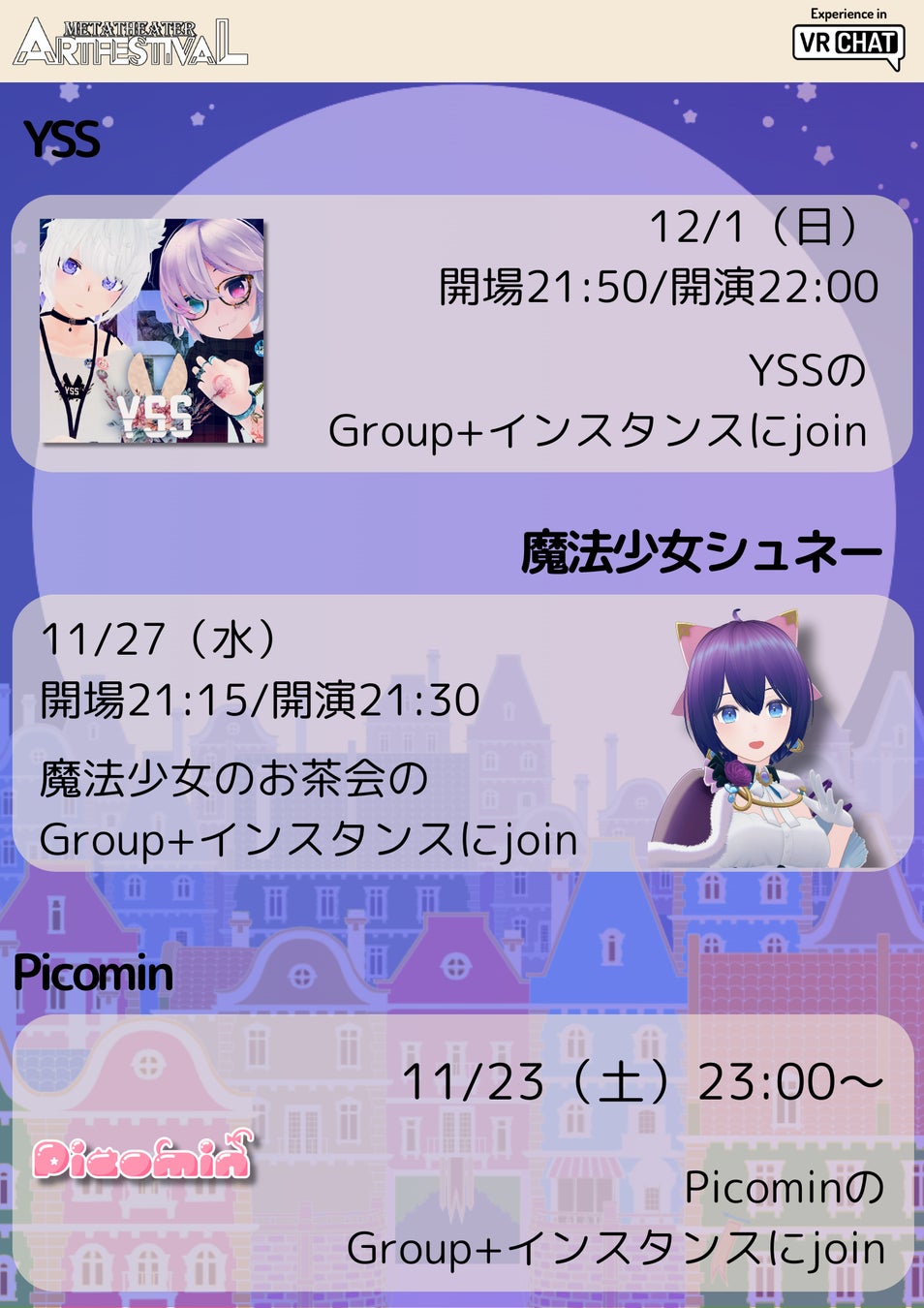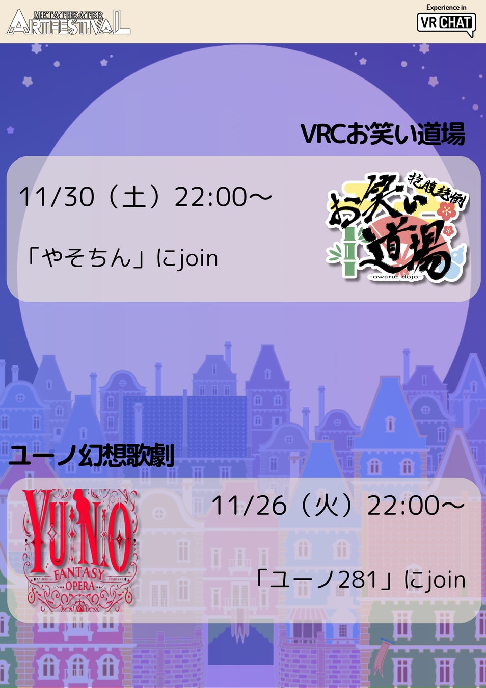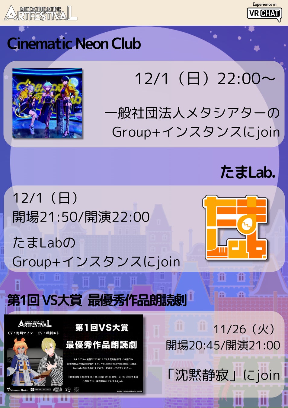 メタシアター演劇祭は、VRChatで活躍するパフォーマンスグループ、ダンサー、ミュージシャン、映画制作チームを特集するアートフェスティバルです。