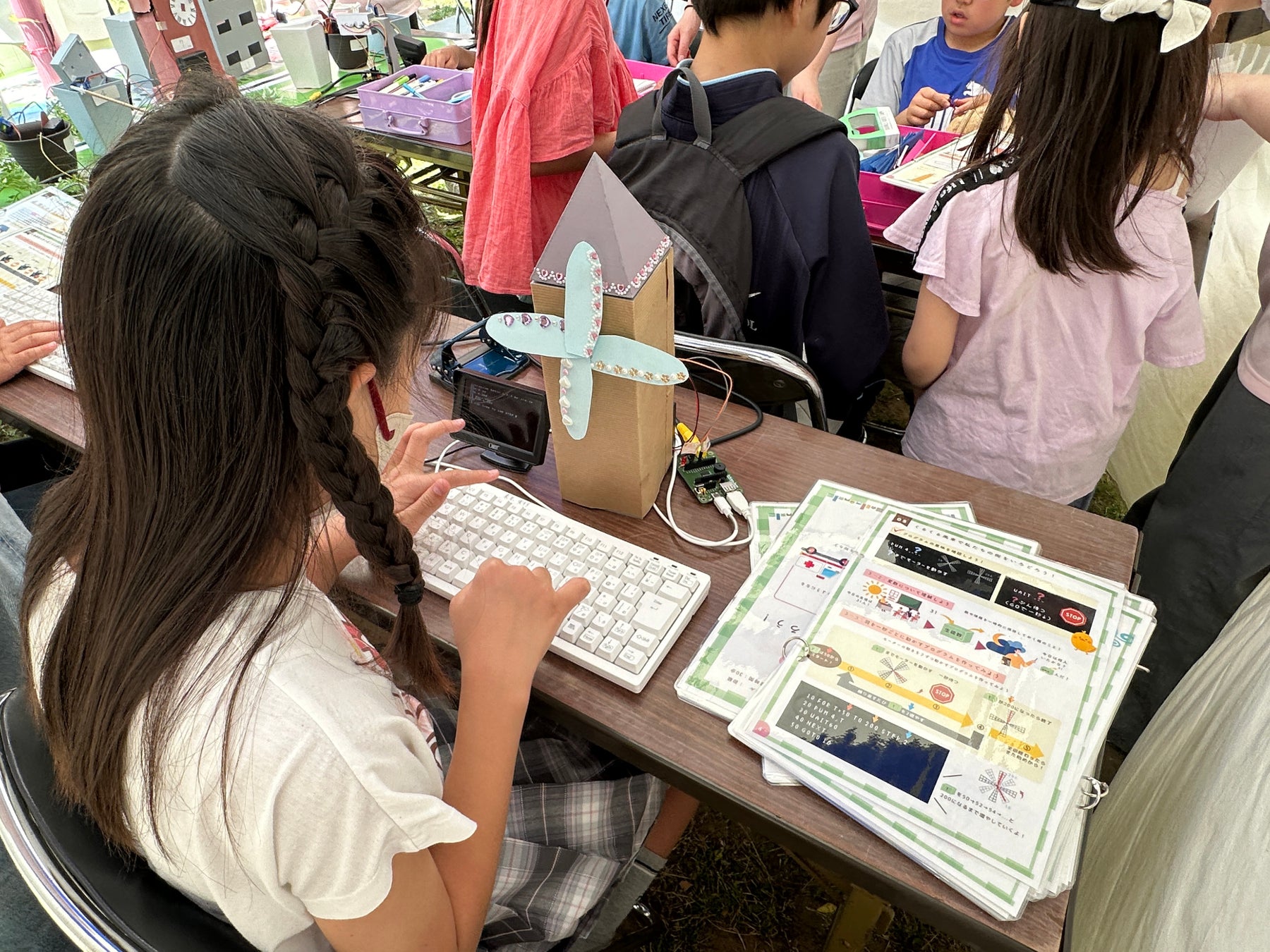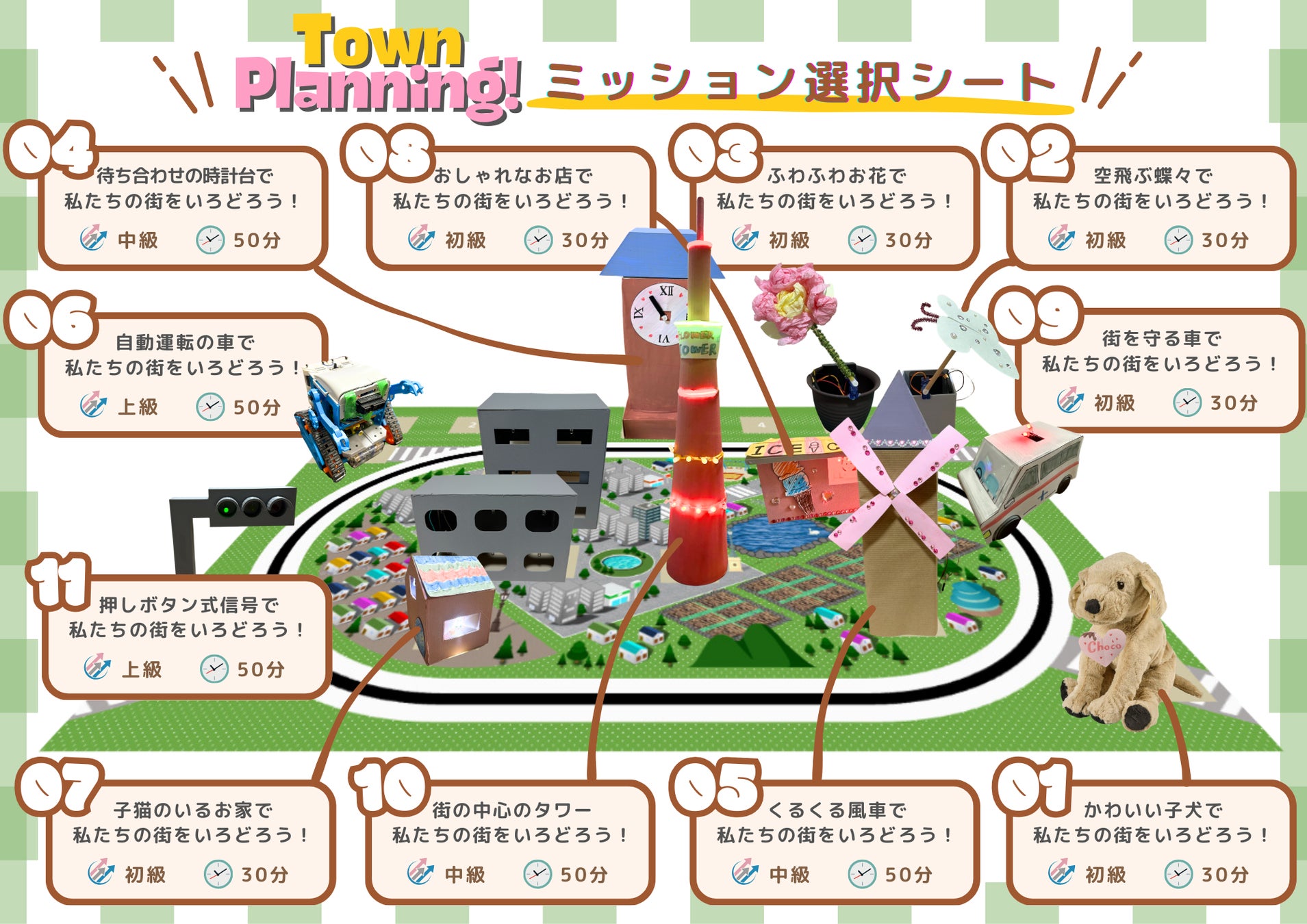 今回のイベントでは、「まちづくり」をテーマに、小さな街のイルミネーションや風車、車や信号機をプログラミングの力で動かす体験ができます。