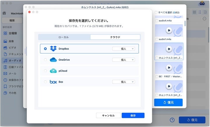 復元したファイルをローカルドライブ、外部ストレージデバイス、そしてクラウドプラットフォーム(iCloud、Dropbox、OneDrive、GoogleDrive、pCloud、Box)まで保存してくれます。