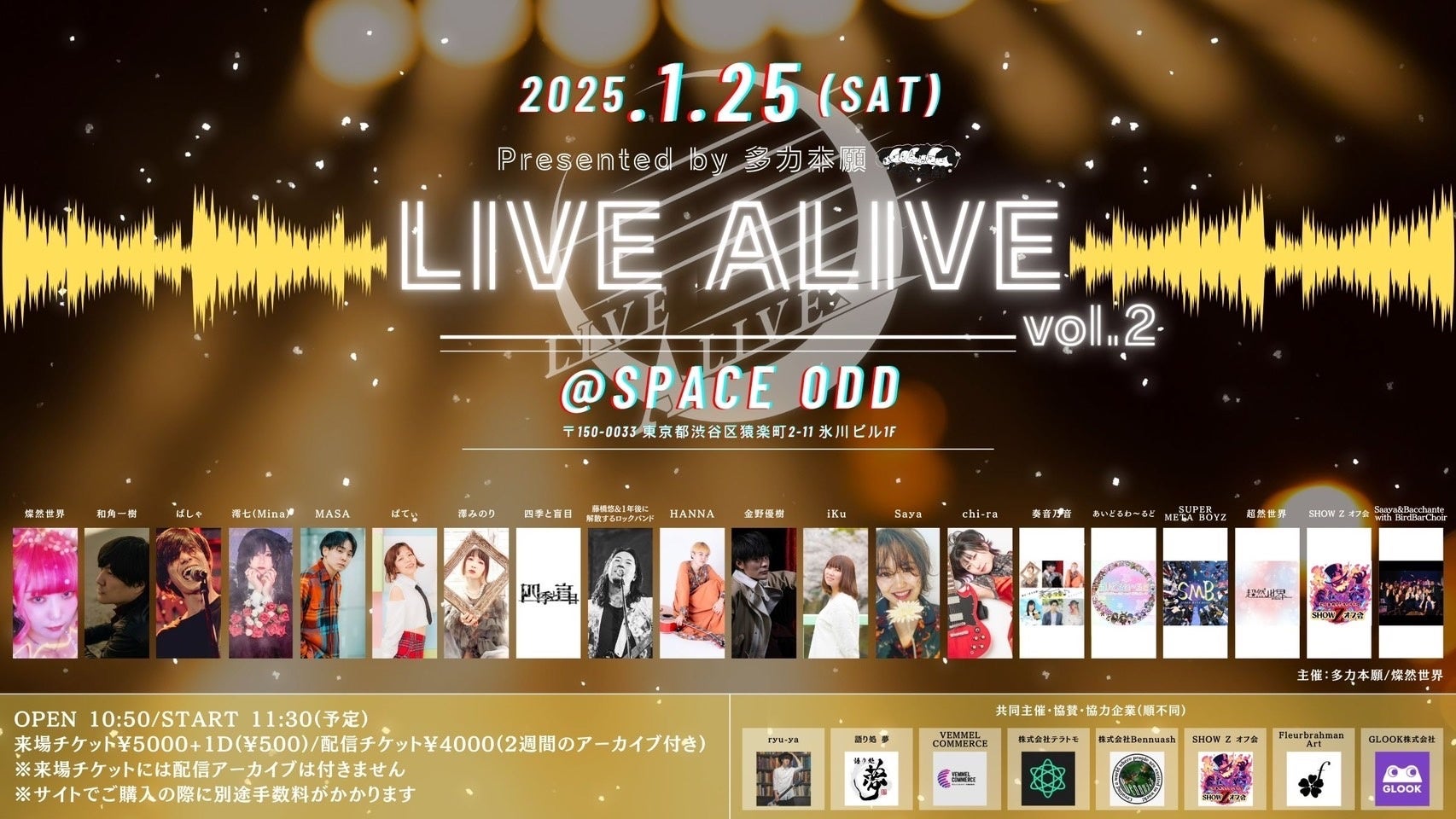 2025年1月25日(土)、東京都渋谷区のライブハウス「SPACE ODD」にて、音楽ライブフェスとビジネスカンファレンスが融合した新感覚のイベント「LIVE ALIVE vol.2」を開催いたします。本イベントは、「エンタメ」×「ビジネス」の新たな形を模索し、WEB3.0を通じて新たな未来を創造することをテーマに掲げています。