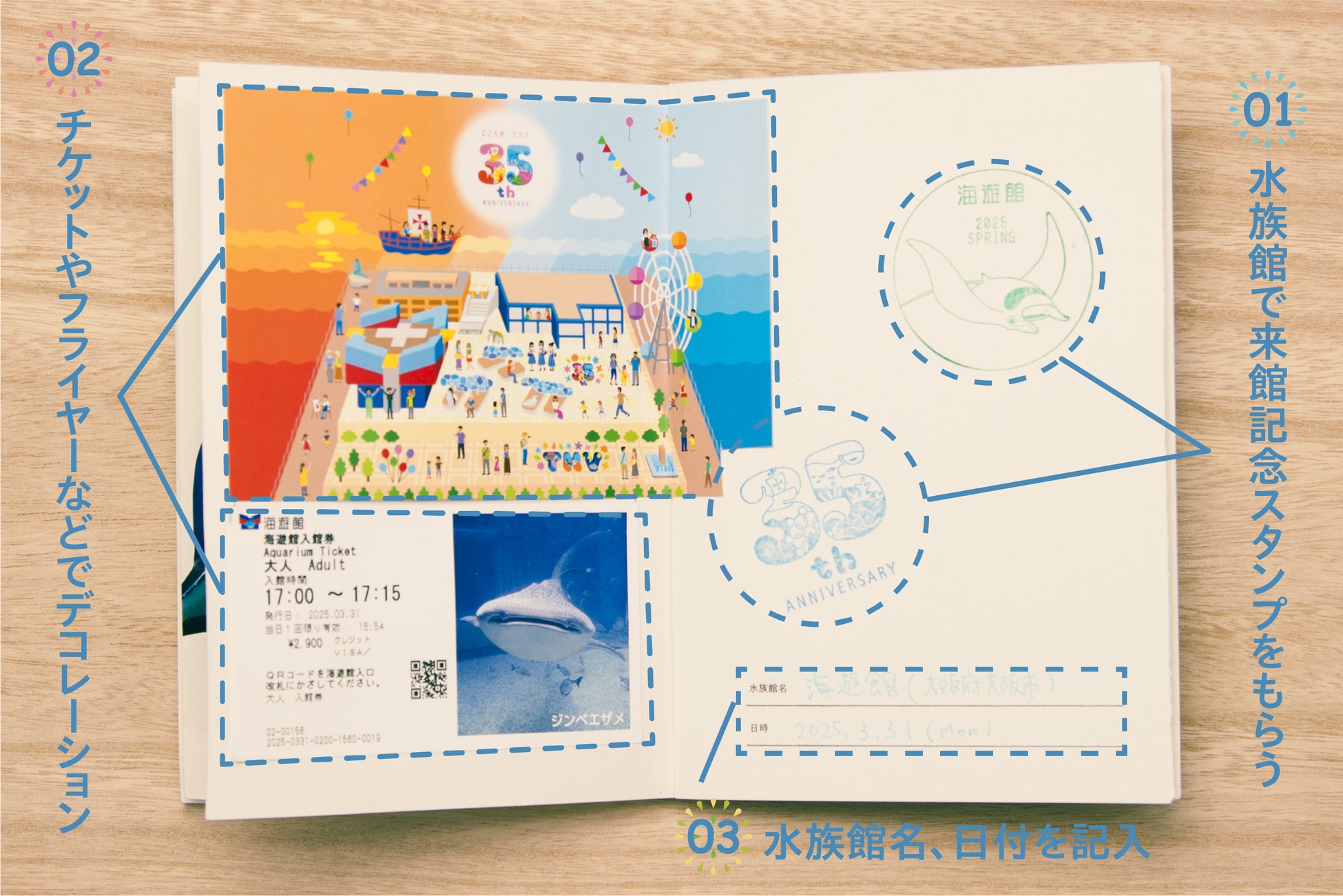 水族館のスタンプを押すページと、入場時の半券やポストカードを貼るフリーページ、漫画形式で物語や感動を描けるコマ割りレイアウト2ページの合計4ページで1つの水族館を記録する構成です。