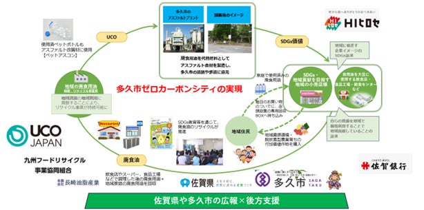 Roa(d)cal SDGs Projectを通じたゼロカーボンシティ実現への取組を多久市へ提案させていただく過程において、家庭系廃食油のリサイクルの推進を多久市として正式に決定したことを受け、廃食油リサイクルの全国団体である「全国油脂事業協同組合連合会」と、傘下組合である「九州フードリサイクル事業協同組合」の4者での包括連携協定を締結する運びとなりました。