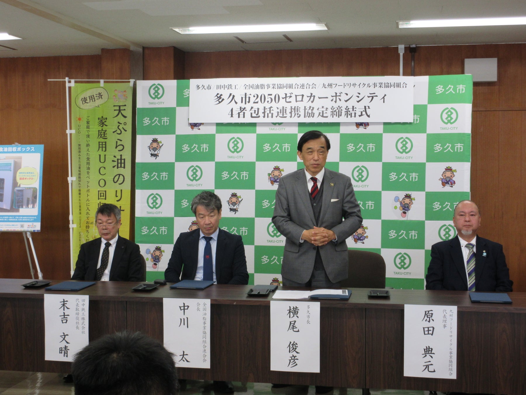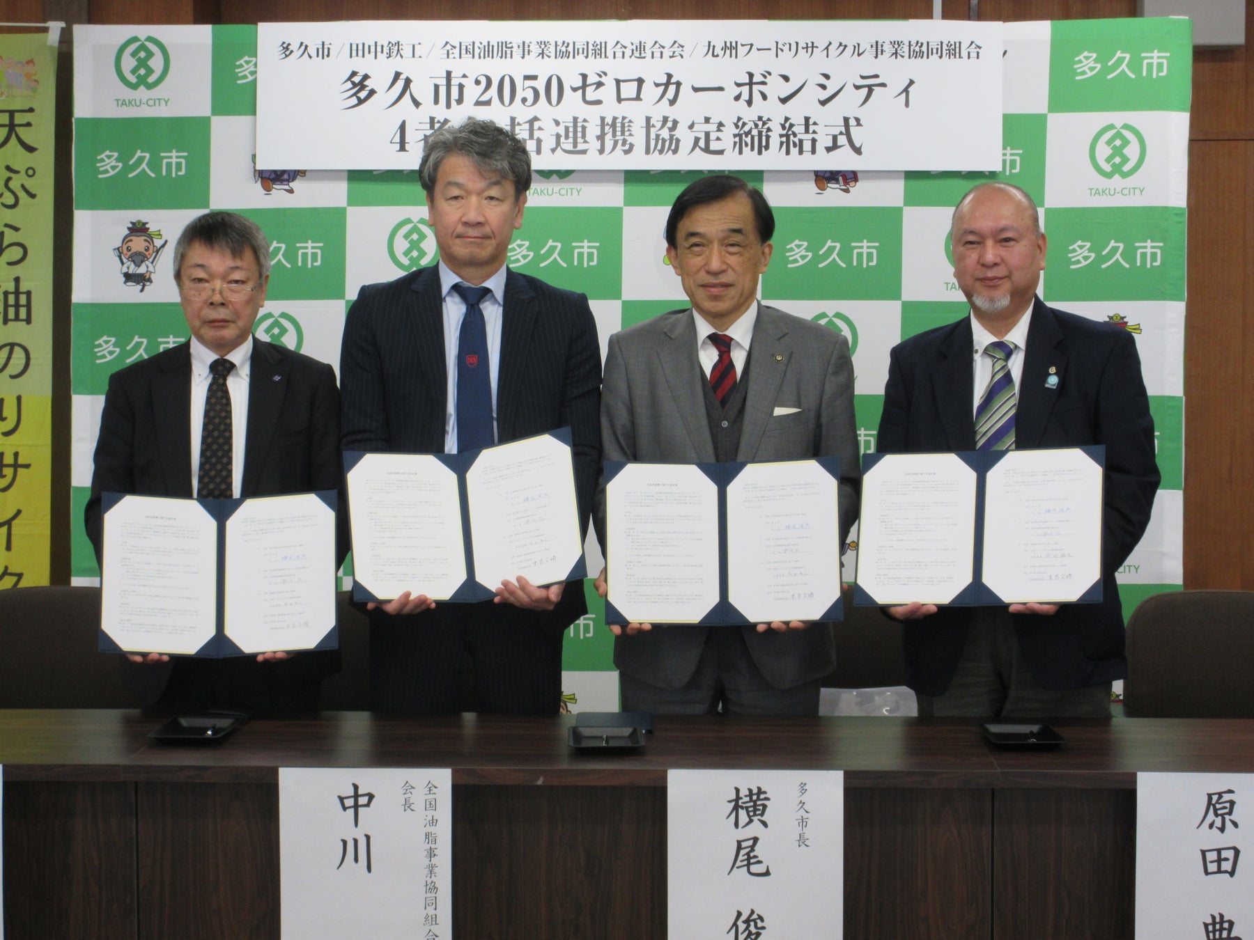 多久市・田中鉄工株式会社・全国油脂事業協同組合連合会・九州フードリサイクル事業協同組合 多久市2050ゼロカーボンシティ 4者包括連携協定を締結