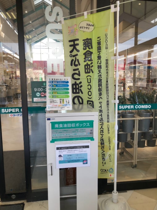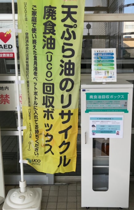 ▼多久市中央公民館とHiヒロセスーパーコンボ多久店に設置された「廃食油回収BOX」