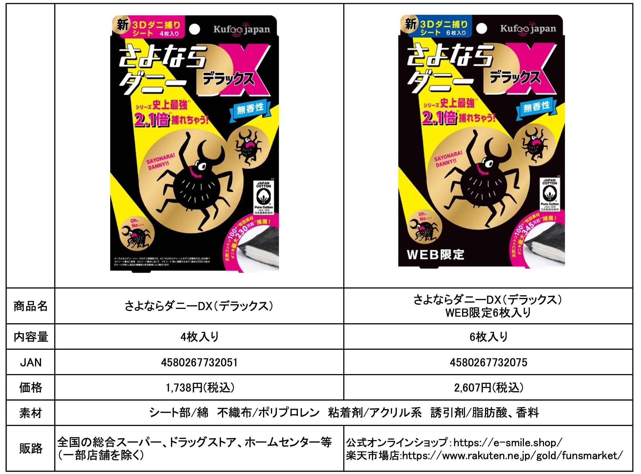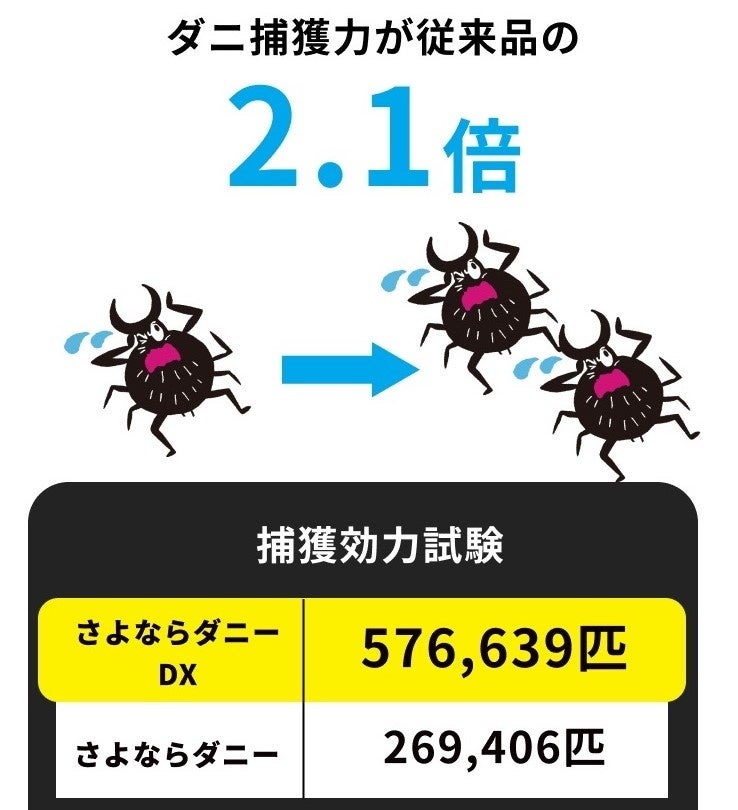「さよならダニーDX」は、累計販売数2,300万枚(※2)の「さよならダニー3Dダニ捕りシート」の強化版として2024年1月に発売されました。コンパクトサイズのシートをダニが気になる場所に置くだけで、シリーズ史上最高、1枚当たり57万匹(※3)のダニが捕獲できるダニ捕りシートです。(※4)