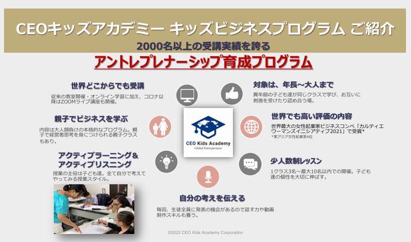 このCEOキッズビジネスプログラムは、世界最大の女性起業家ビジネスコンテスト、「カルティエウーマンズイニシアティブ2021」にて東アジア第4位を受賞し、世界からも応援されているプログラムです。