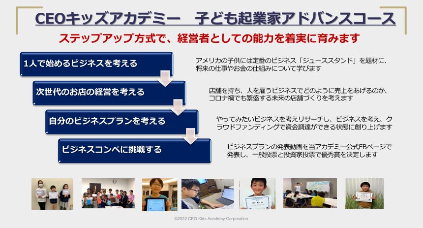 CEOキッズアカデミーの『子ども起業家アドバンスコース』は、小学3年生から大学生(希望が