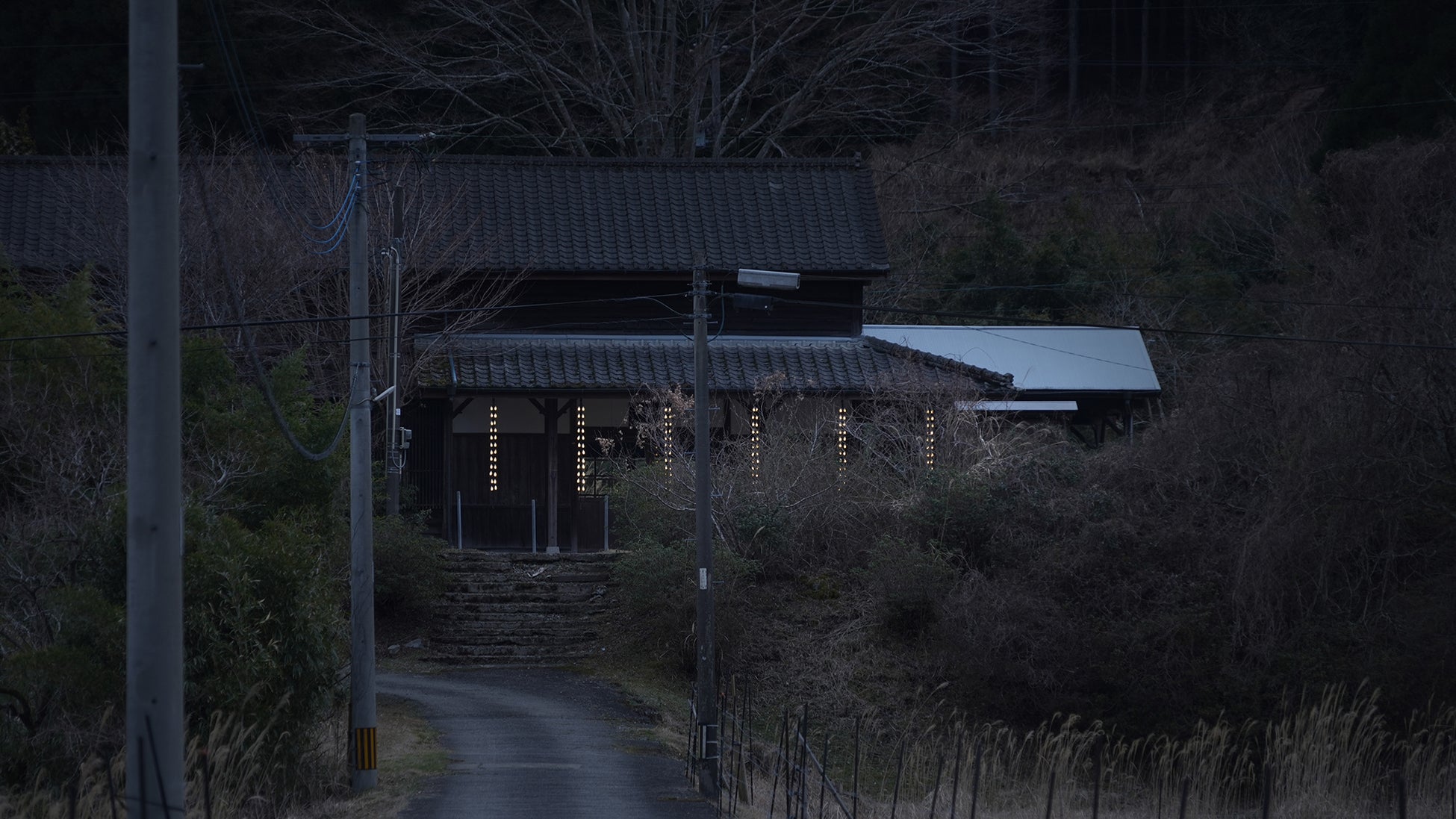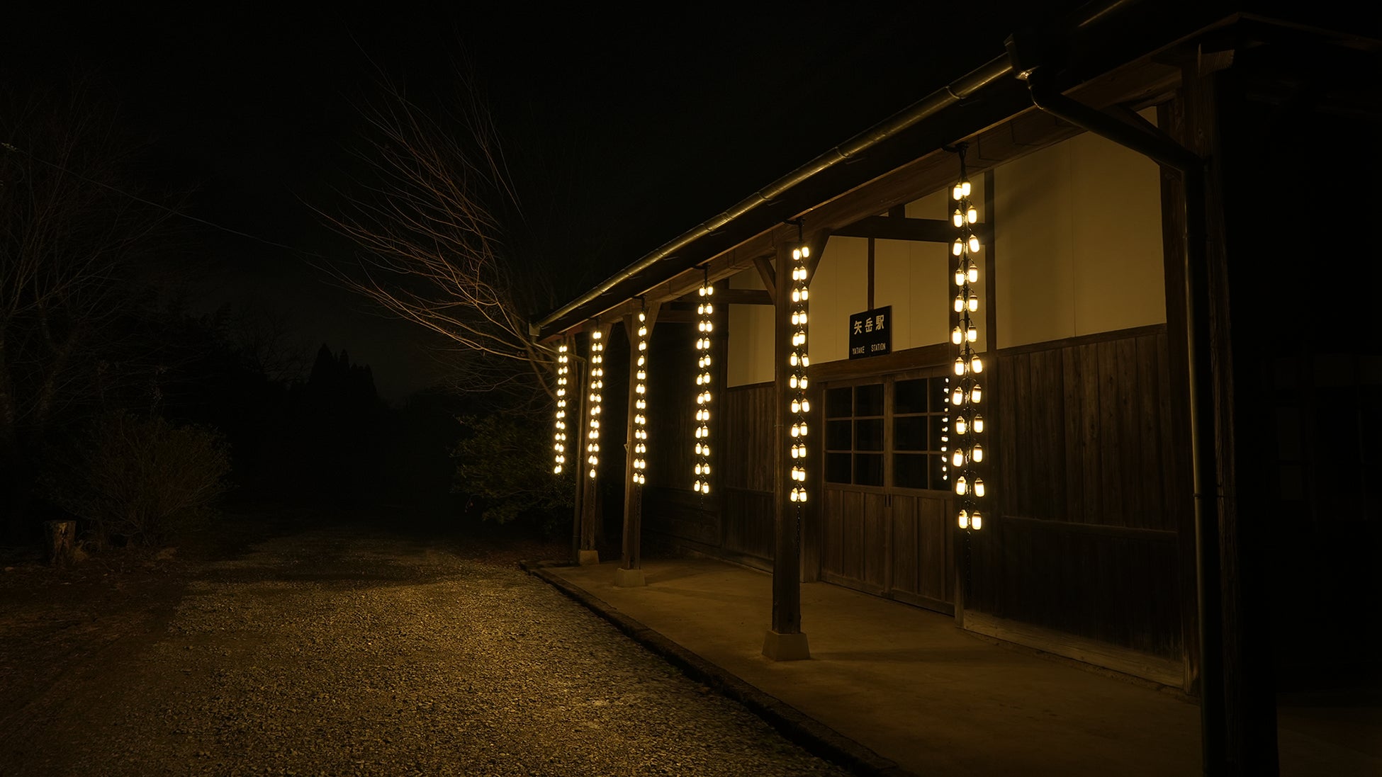百年の木造駅舎と周囲の山々に呼応するように、優しい光の動きが空間に詩的な静けさをもたらします。