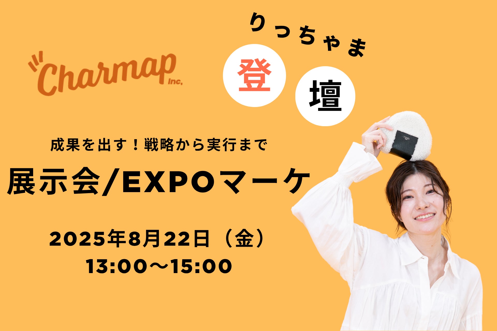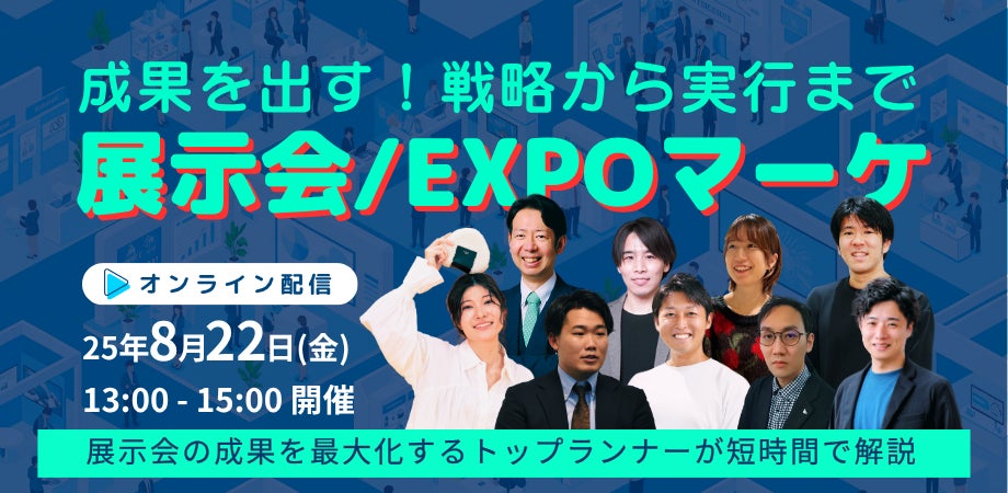 Charmap株式会社は、展示会/EXPOマーケティング担当者向けWebカンファレンス『成果を出す!戦略から実行まで 展示会/EXPOマーケ』(以下 本イベント)に、2025年8月22日(金)13:00〜15:00に登壇いたします。本イベントでは、展示会の成果(リード獲得・商談化・ROI 向上)を最大化する実践ノウハウを、マーケティング・営業の最前線で活躍するトップランナーが紹介いたします。Charmap株式会社からは『EXPO特化型キャストで成果激変!展示会オペレーションの最適化』について解説いたします。参加費無料・オンライン限定のイベントです。