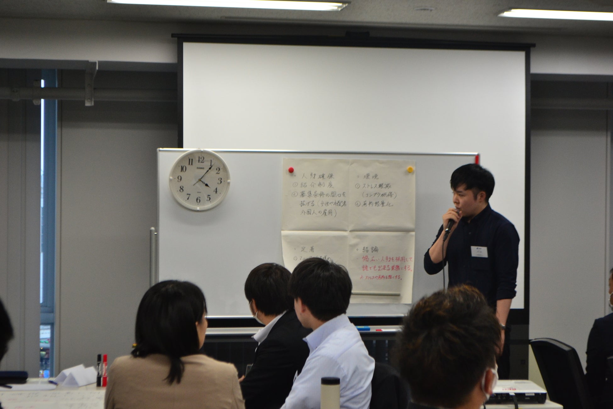 各社3-4名ずつで構成された5つのグループで「人材の確保・定着」および「働きやすい環境」に関する解決策を議論し、発表しました。その発表内容をカテゴリーごとにまとめて紹介します。
