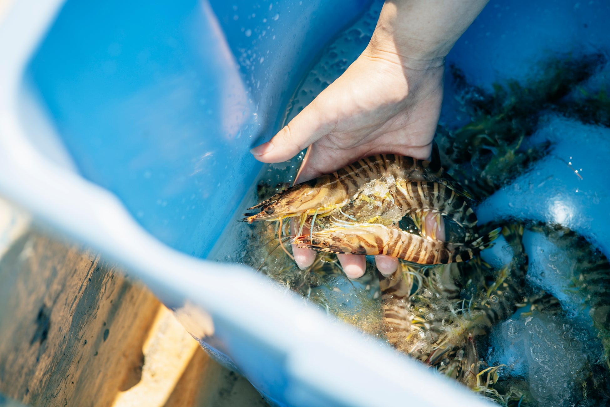荷捌き所は養殖池の目と鼻の先。小型の籠で少量ずつ漁獲した低ストレス状態の車エビを、荷捌き所ですぐに冬眠状態にし、一尾ずつ丁寧に箱詰めしています。