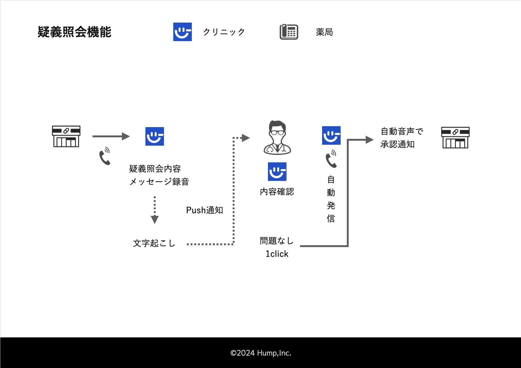 株式会社 Hump(本社:東京都中央区、代表取締役:東宮 真樹、以下 Hump)は、クリニック向け電話自動応答SaaS「メディコル」(https://www.medicall.jp/ )において、薬局からの疑義照会を自動で受け付け、医師・医療スタッフがワンクリックで回答できる新機能を2025年5月29日にリリースしました。本機能については特許を出願済み(出願番号:特願2025-089318)であり、クリニックの電話業務効率化における独自性と先進性をさらに高めます。