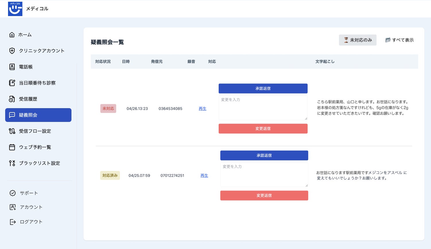 ――という課題が医療現場の負担として顕在化していました。メディコルはこれらの課題を解決するため、疑義照会の自動受付と履歴管理、返信対応(ワンクリック対応)を一体化した機能を開発しました。