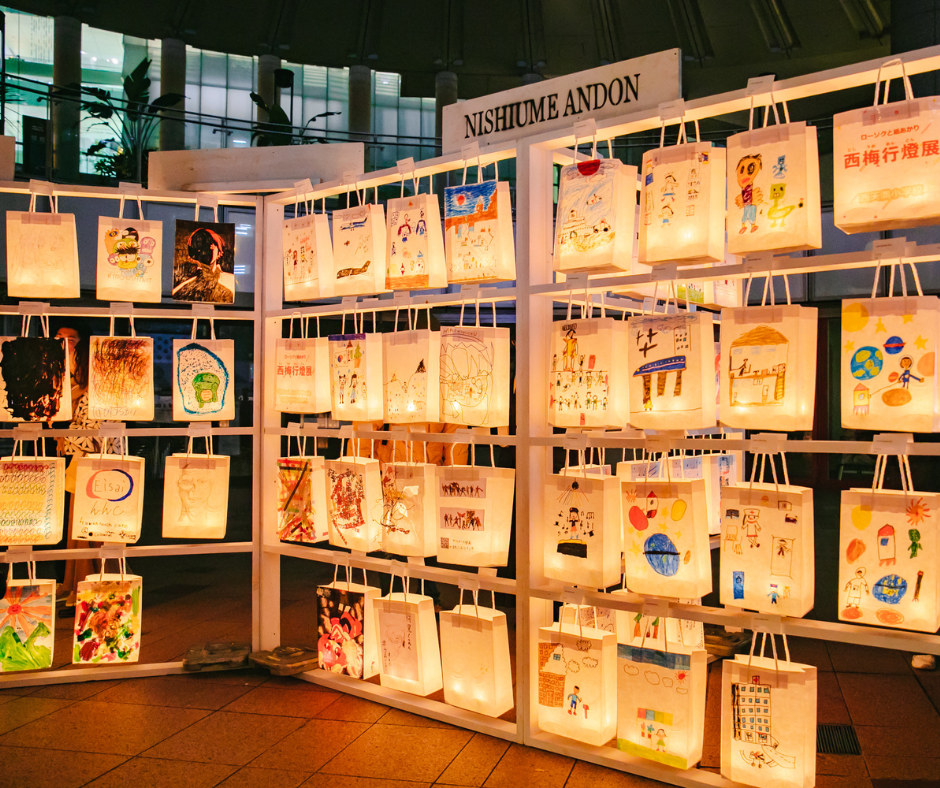 日本古来のあかり「行燈」にヒントを得た⻄梅田発祥のペーパーバック型の手作りオリジナル行燈を展示する「西梅行燈展」では、能登半島地震で被害にあわれた能登町立小木小学校の生徒をはじめ、能登の皆さんが作成した行燈も展示します。本イベントの総合ディレクターであるCANDLE JUNE氏は、1月2日に能登町入りして以来、物資提供や炊き出しなど支援活動を続けており、交流を深めるなかで今回のイベント参加が実現しました。