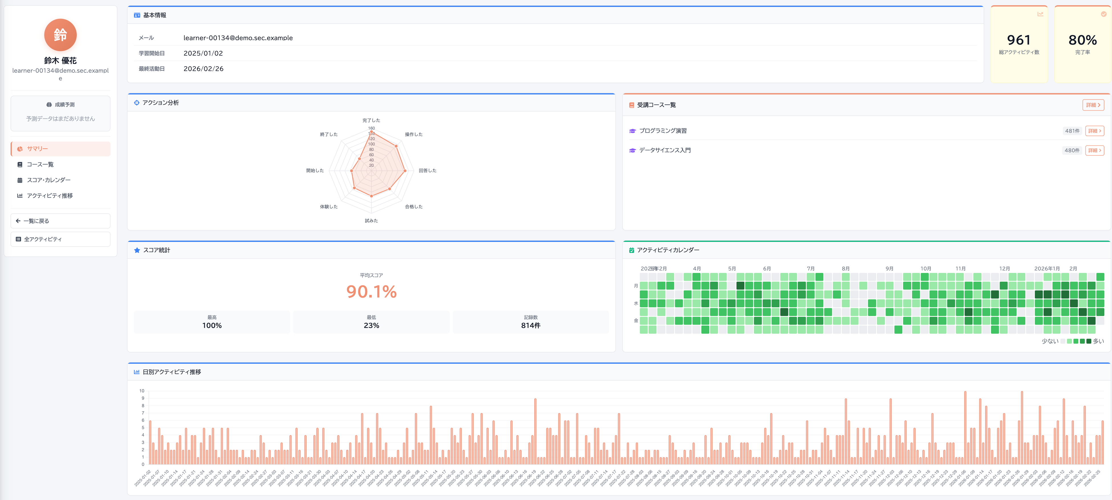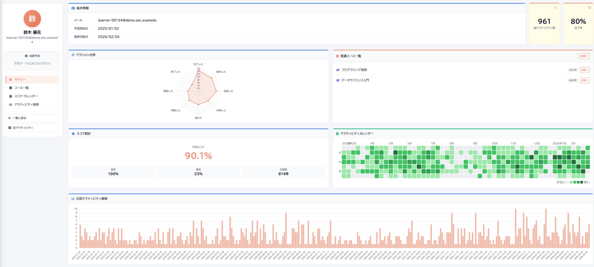 クラス単位のダッシュボードによる俯瞰と、受講者個別の詳細情報確認の両方をシームレスに行えます。出席・課題提出状況・最終アクセス・活動頻度・試行回数など、指導・面談に必要なデータをリアルタイムで把握できます。