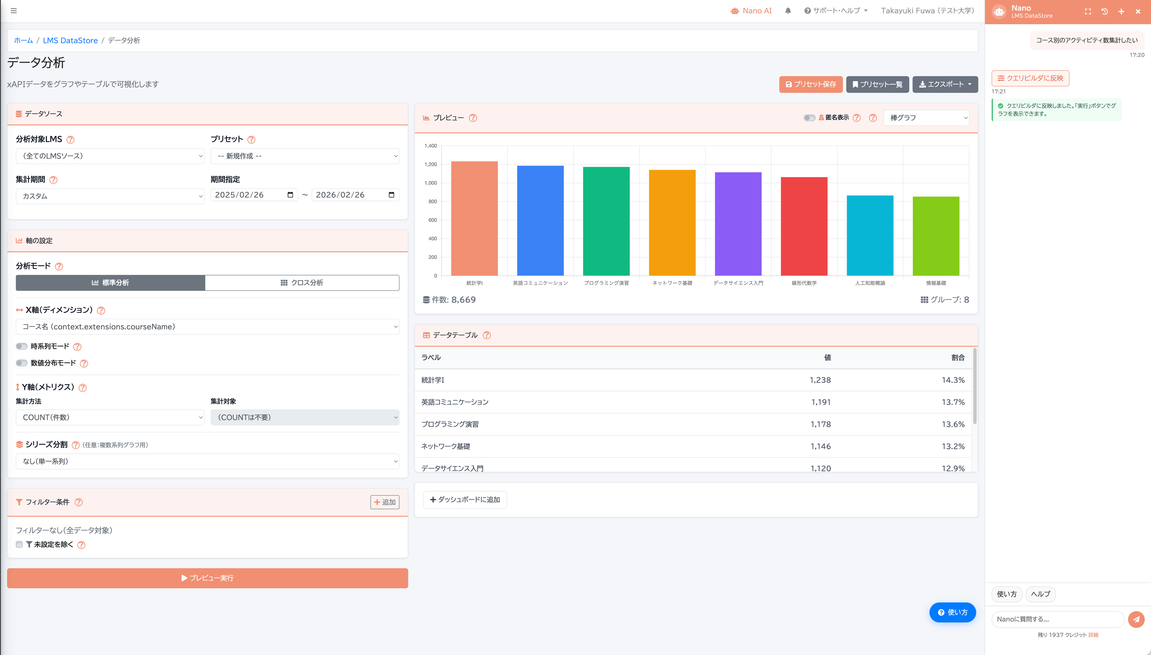 Moodle等のオープンソースLMSをはじめとする複数の学習管理システムから学習行動データを自動収集し、対話型AIアシストによるグラフ自動生成・リスク予測・成績予測を行う統合ラーニングアナリティクス基盤として提供します。