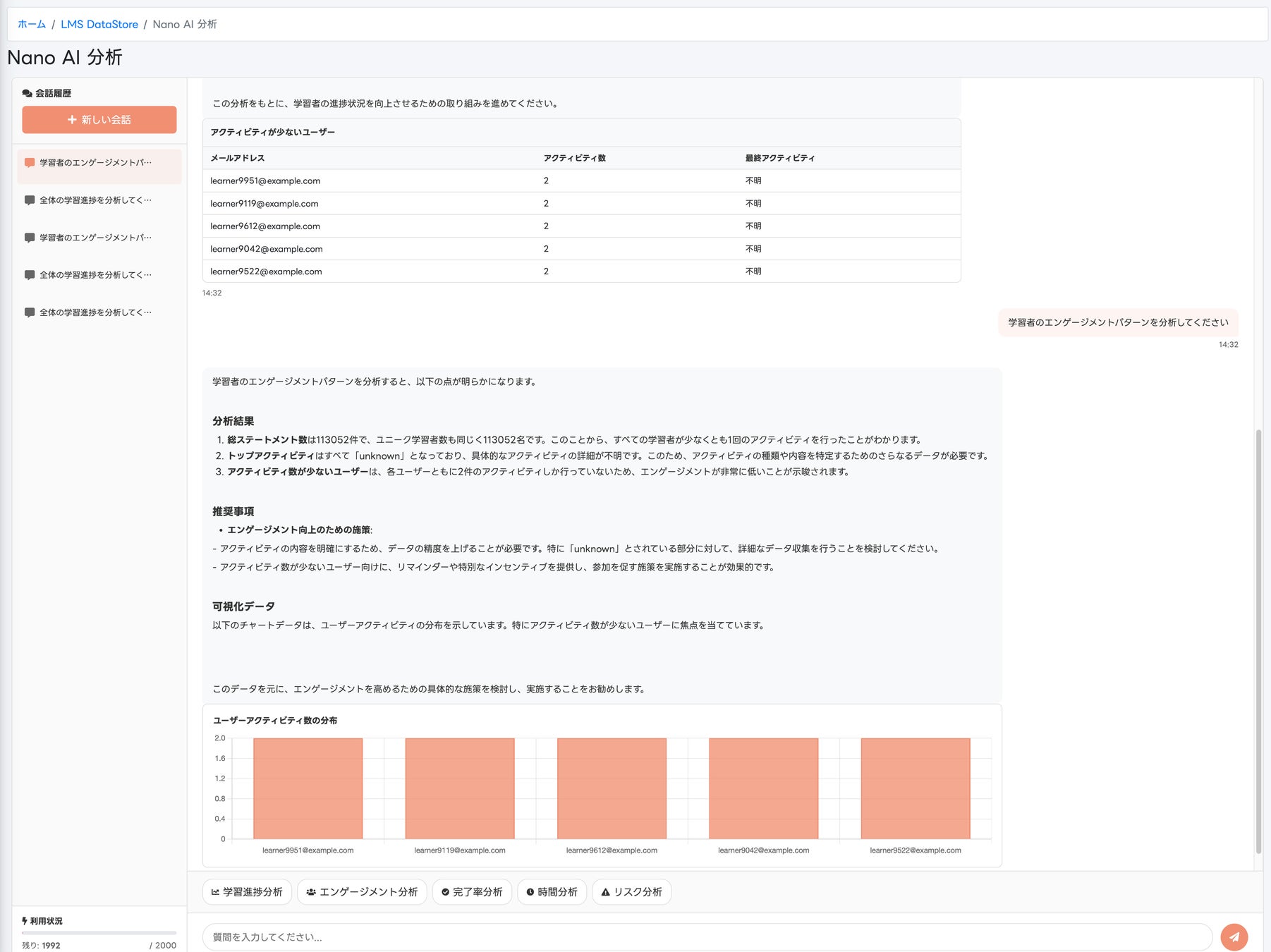 「かんたんLRS」では「学習者のエンゲージパターンを分析してください」と自然言語で入力するだけで、集計・グラフ生成・要注意学生の抽出・改善アクション提案までをAIが自動実行。専門的な分析スキルは一切不要です。