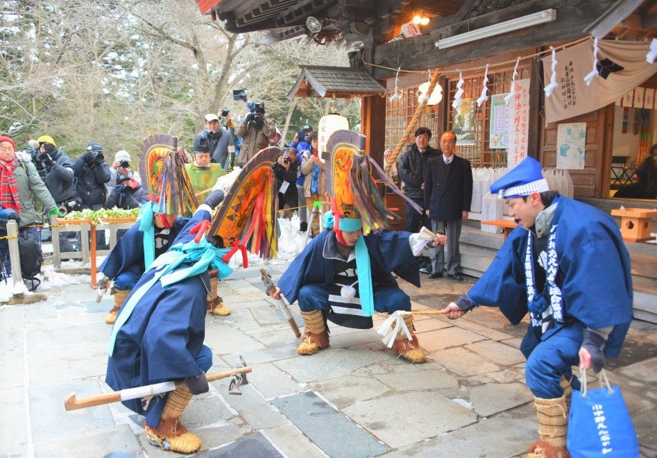全えんぶり組が長者山新羅神社に集まり、本殿の前でえんぶりの舞を奉納します。冬の早朝、冷たく澄み切った空気の中、神前で行われるえんぶりは厳かな雰囲気です。奉納の後には撮影会も行われます。(撮影会は常番町えんぶり組、賣市えんぶり組)