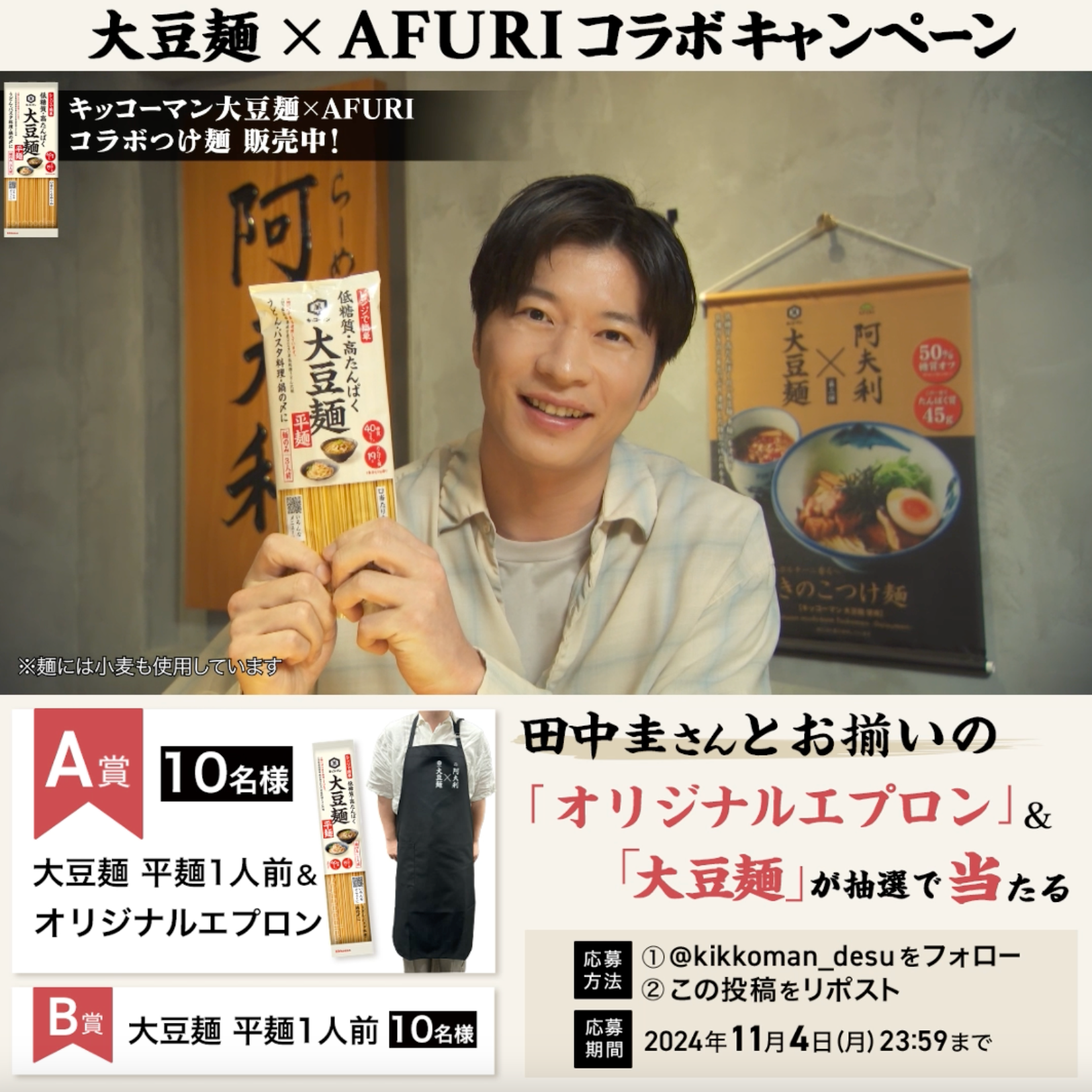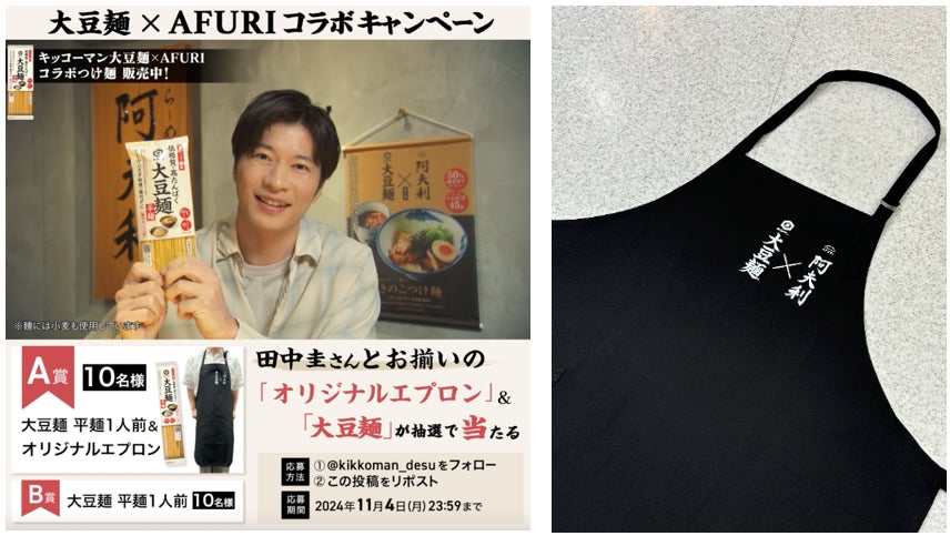 田中圭さんが店舗訪問時に着用していたものと同じデザインの「大豆麺×AFURI」のオリジナルエプロンが当たる、プレゼントキャンペーンをキッコーマン公式Xで実施します。