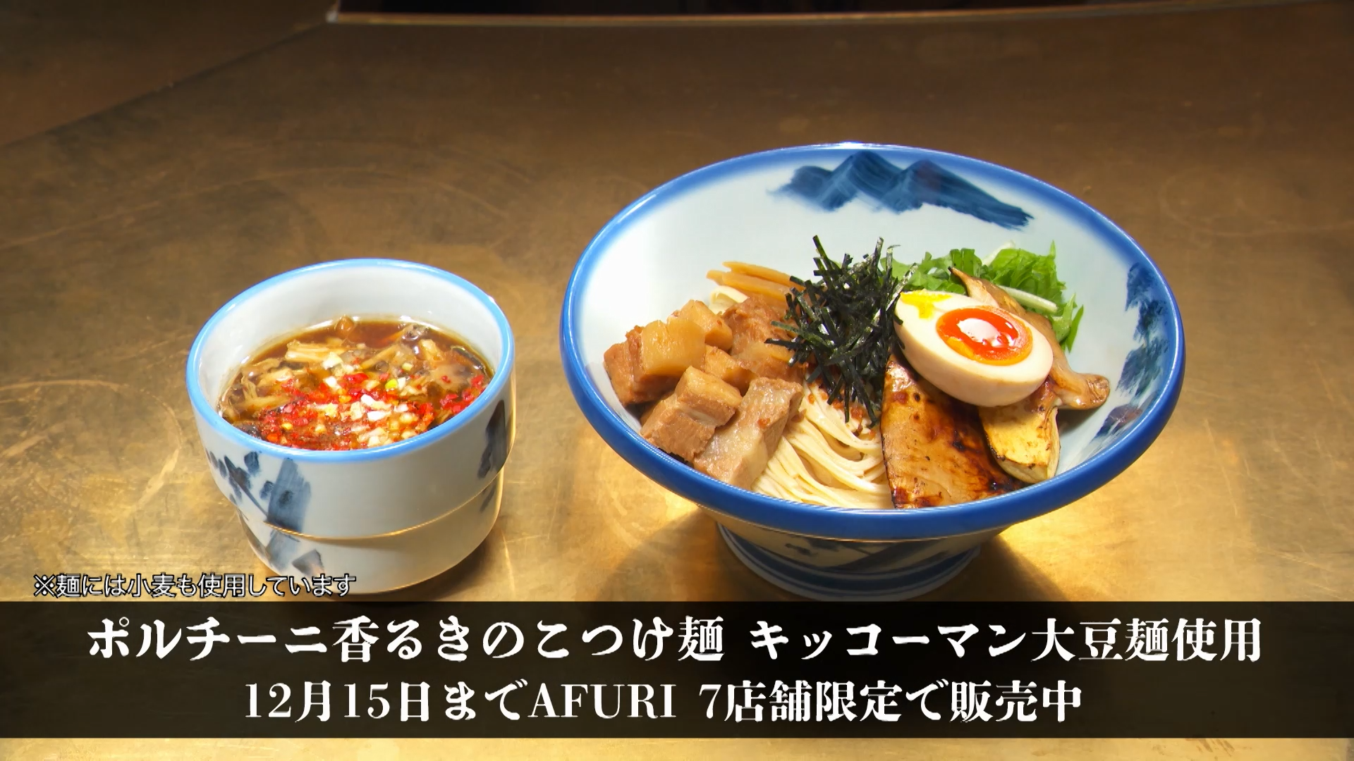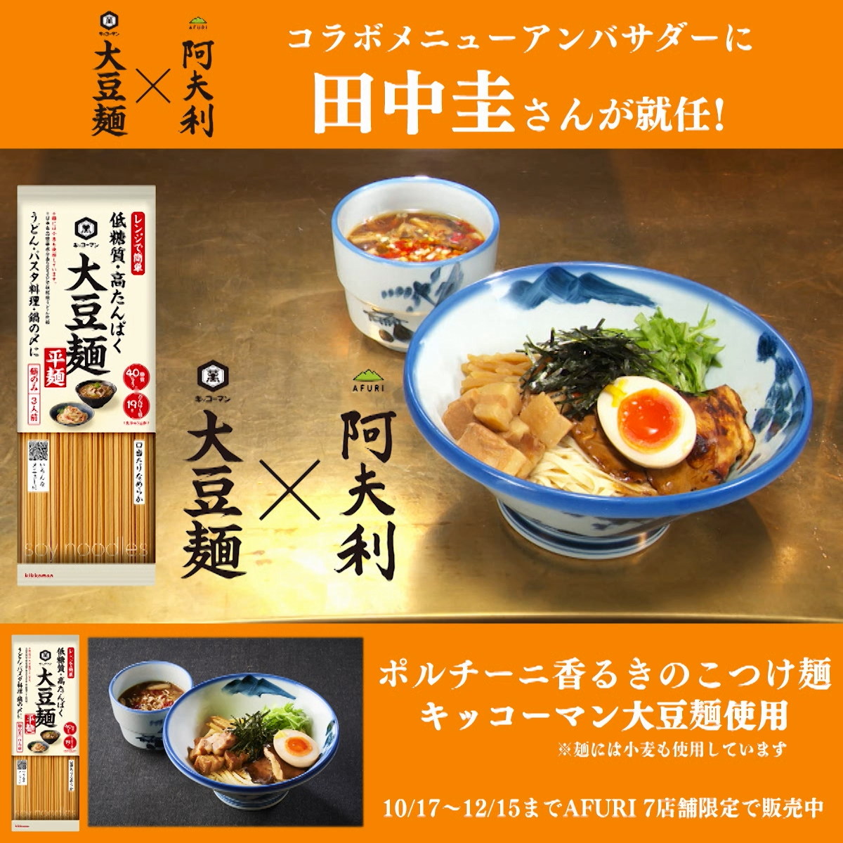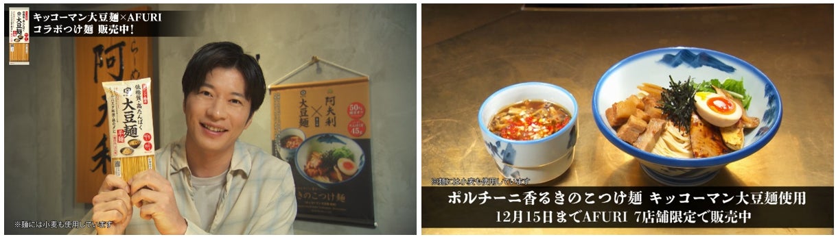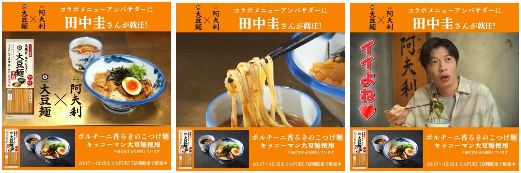 AFURI株式会社とキッコーマン食品株式会社は、コラボレーションメニュー「ポルチーニ香る きのこつけ麺 キッコーマン大豆麺使用」を共同開発し、2024年10月17日(木)から12月15日(日)までの期間、ラーメン店「AFURI」の7店舗限定(南青山、中目黒、麻布十番、恵比寿、六本木交差点、六本木ヒルズ、三軒茶屋)で提供しています。そして今回、大豆麺のCMキャラクターを務める俳優の田中圭さんがコラボアンバサダーに就任し、タイアップ実施中のAFURI店舗に潜入。その様子が見られる田中さん出演のWeb動画計5本を、本日10月29日(火)よりキッコーマン公式YouTube上で順次公開します。動画の公開は12月15日(日)までです。