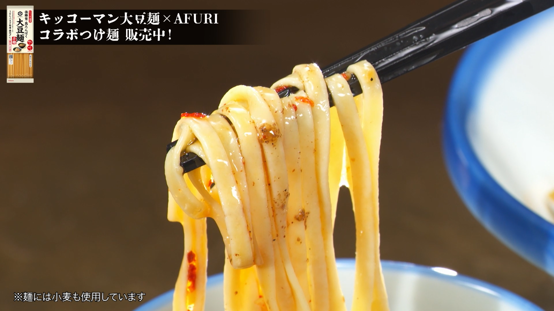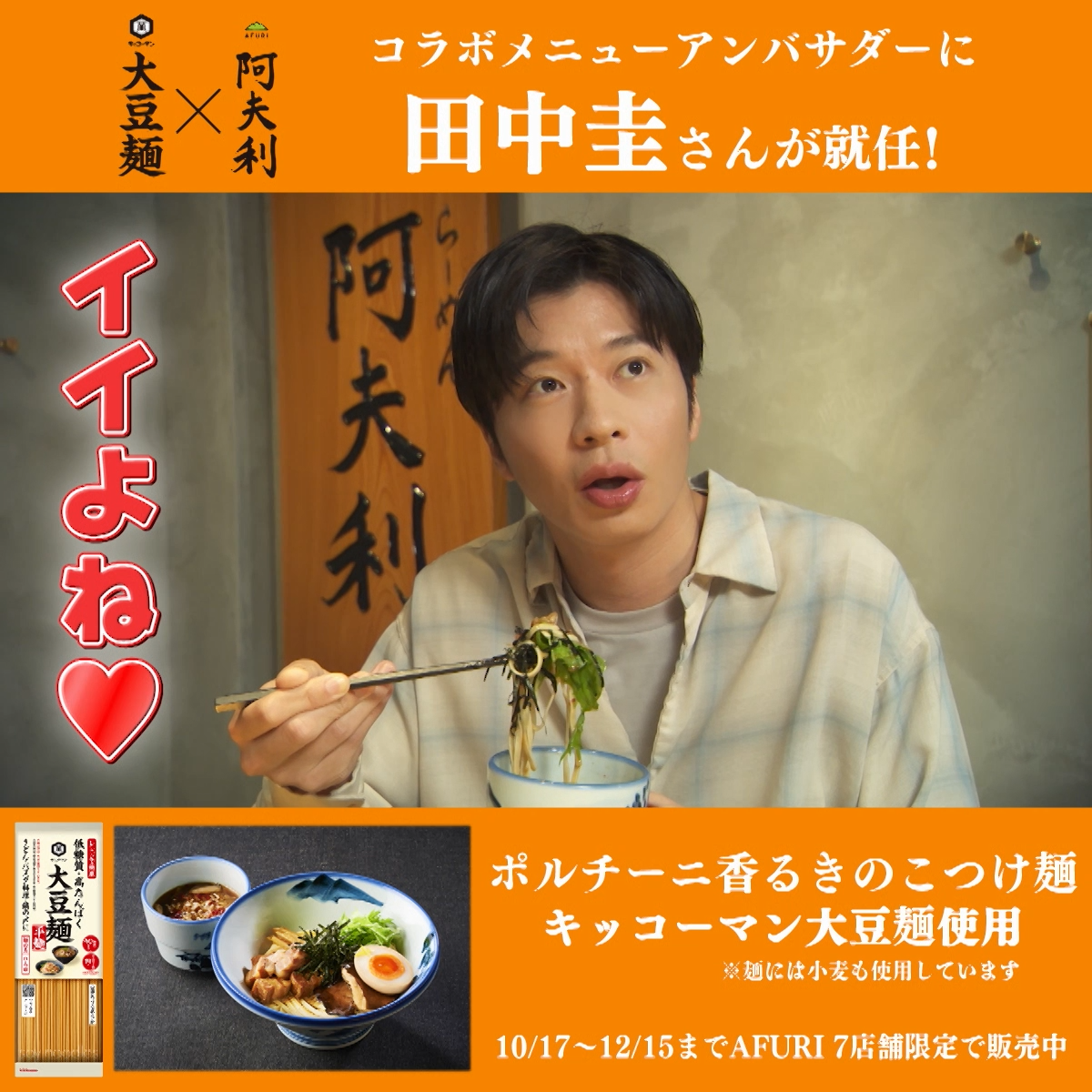 「僕がCMキャラクターを務める大豆麺とAFURIのコラボメニューが12月15日まで販売中です!」と、田中圭さんが元気に登場。大豆麺の紹介をした後、「ポルチーニ香る きのこつけ麺 キッコーマン大豆麺使用」を豪快にすすります。「う~ん!大豆麺が平麺で、濃厚なつけだれによく絡んで、めちゃくちゃおいしいです」とコラボメニューを絶賛。満面の笑顔を見せました。