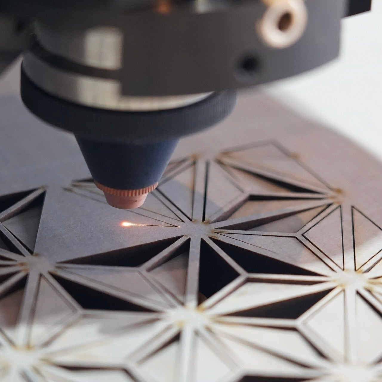 2025年2月より「和モダン N6 北円山」に新工場を併設し、稼働開始。道内最大級の加工面積を誇る最新鋭のレーザー加工機を導入しました。木材やアクリル素材を使用し、組子柄を中心に、さまざまなデザインのオーダーメードに対応しております。最新鋭のレーザー加工により、価格も業界最安値を目指してご提供。実績として道内のラグジュアリーホテルや飲食店、新築住宅オーナー様より、紋入り照明装飾や吊戸棚、屏風家具などの受注をいただきました。