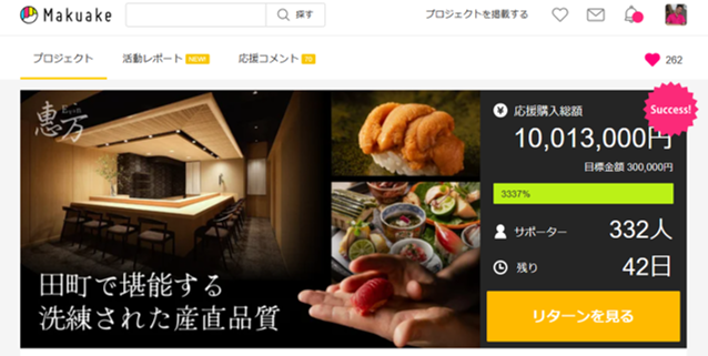 田町鮨 惠万、開始10日で応援購入総額1,000万円を達成!
