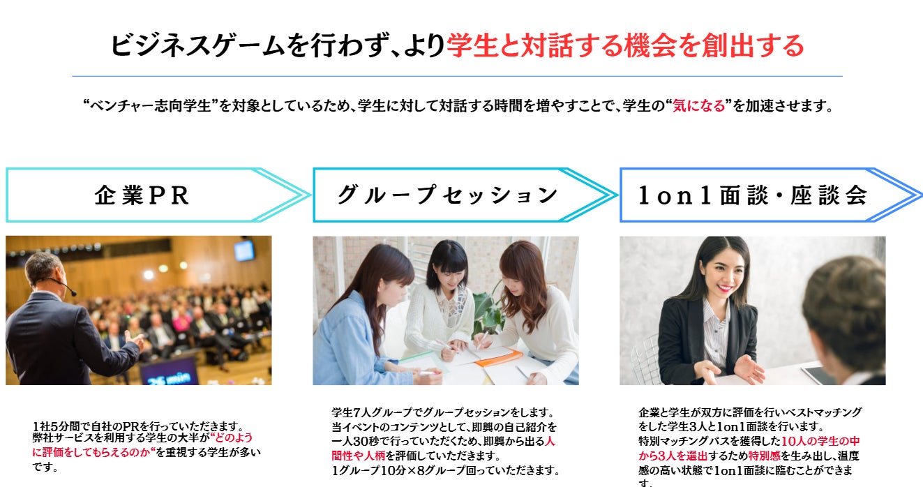 そのため当イベントでは、企業は学生全員と接触できることはもちろん、企業と学生のタッチポイントを多くしています。主なタッチポイントは3つあります。