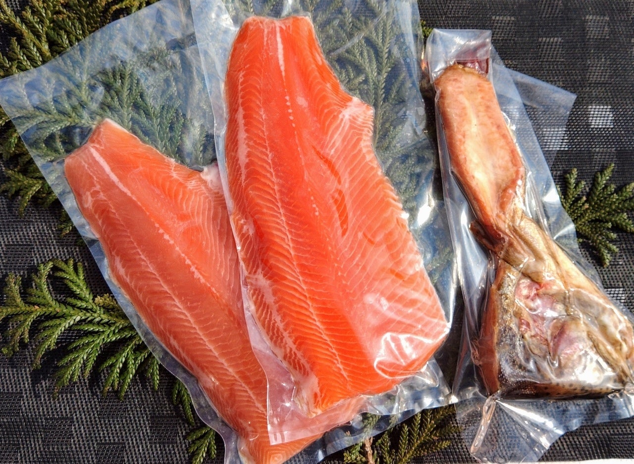お刺身サーモンフィレ2枚と頭やハラスを燻製にした1パックの詰め合わせセットを現在販売中!