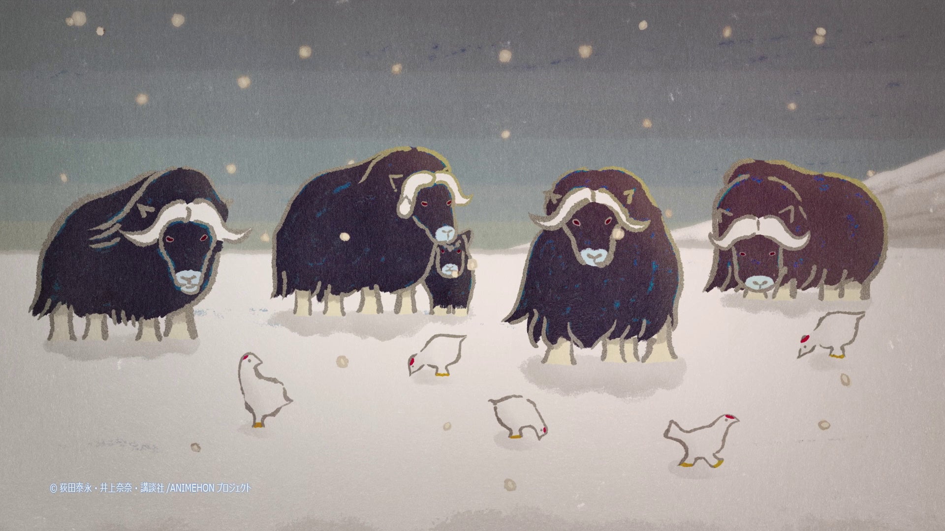 本作のアニメーション制作を担当するのは『映画 すみっコぐらし』シリーズや『アグレッシブ烈子』(NETFLIX)などを手掛けるファンワークス。NHK「みんなのうた」などで活躍するホッチ カズヒロが監督を務め、奥行きや雄大な自然を表現する為に背景に3DCGを取り入れたシーンもあり、北極の地を生きる臨場感を繊細かつ優しい色彩で表現しました。さらに音楽は羽深 由理(はぶか ゆり)が担当し、イヌイットに伝わる独特の発声法による歌と弦楽器を組み合わせ、幻想的な世界感を表しました。