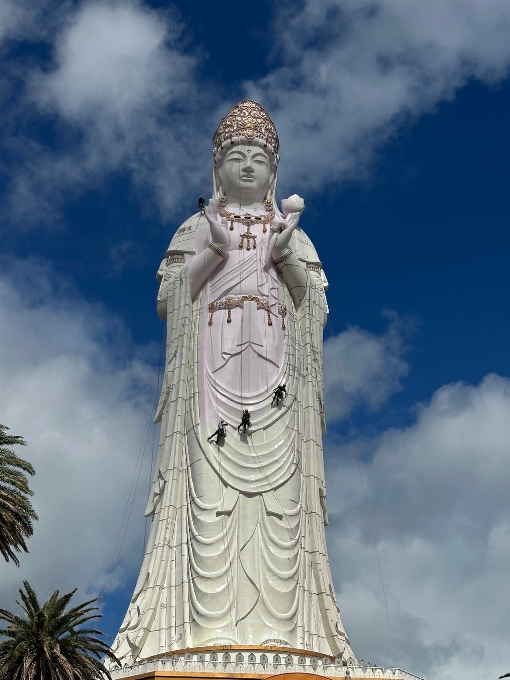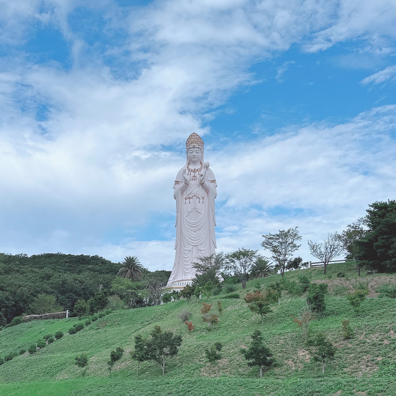 香川県小豆郡土庄町の「小豆島大観音」では、建立30周年を記念し、大規模な塗り替え工事を実施しております。現在は下塗り工程により観音様は“桃色”に染まった特別なお姿で、10月中旬頃まで「桃色大観音」としてご参拝いただけます。