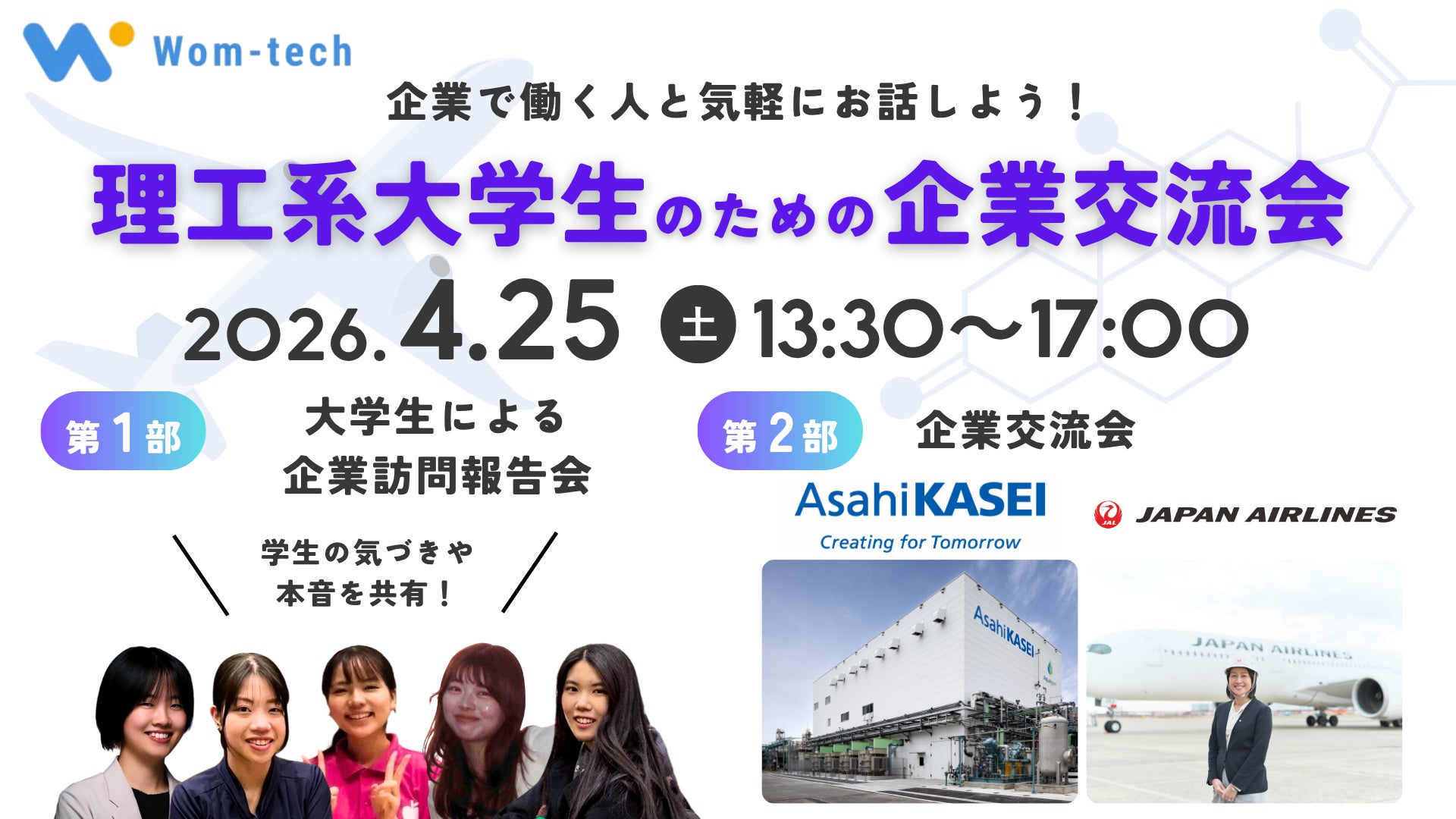 理工系女性コミュニティ Wom-tech は、旭化成株式会社 および 日本航空株式会社 と連携し、STEM分野(※)で学ぶ大学生を対象とした企業交流イベント「理工系大学生のための企業交流会」を、2026年4月25日(土)に東京駅周辺で初開催します。
