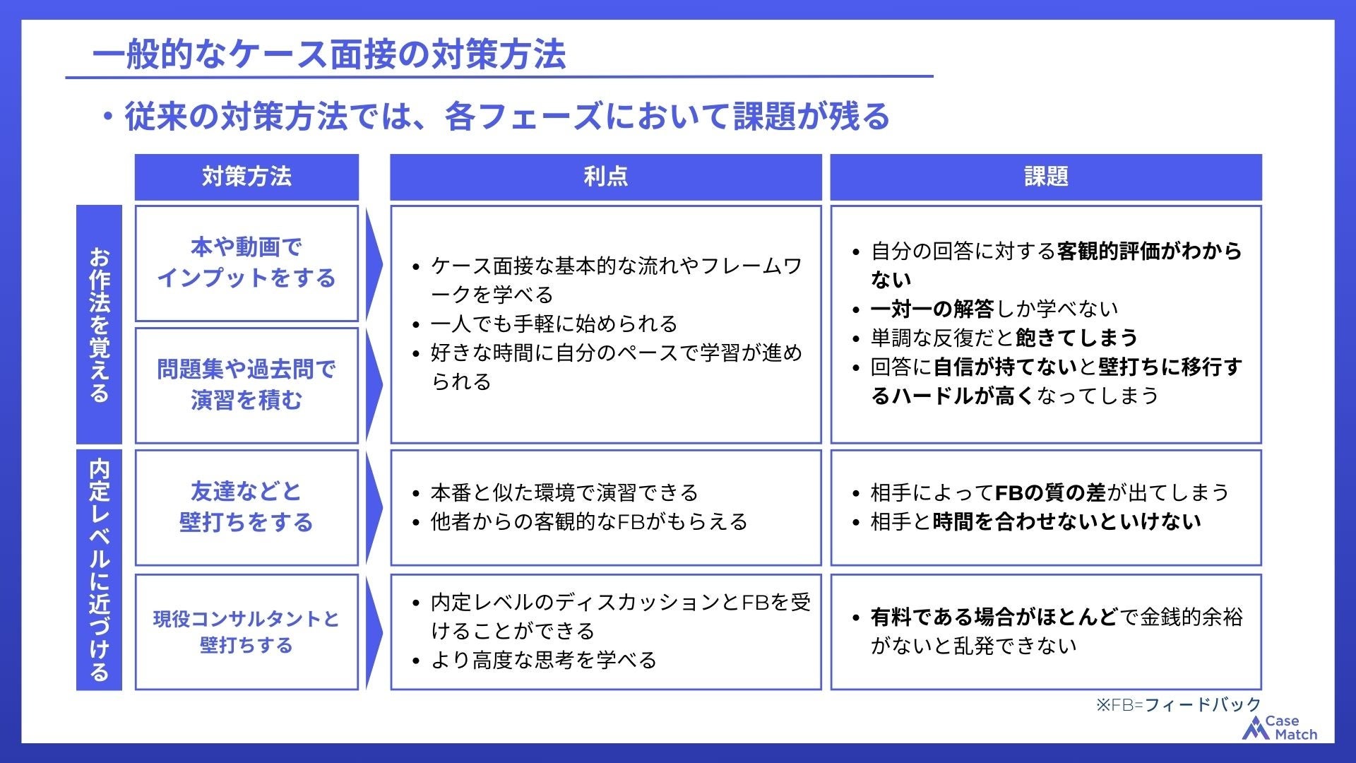 戦略コンサルに内定する上で最も難易度が高い選考であるケース面接ですが、その対策方法は限定的であり内定者などとのコネクションの有無により実力差が大きくついてしまっていました。