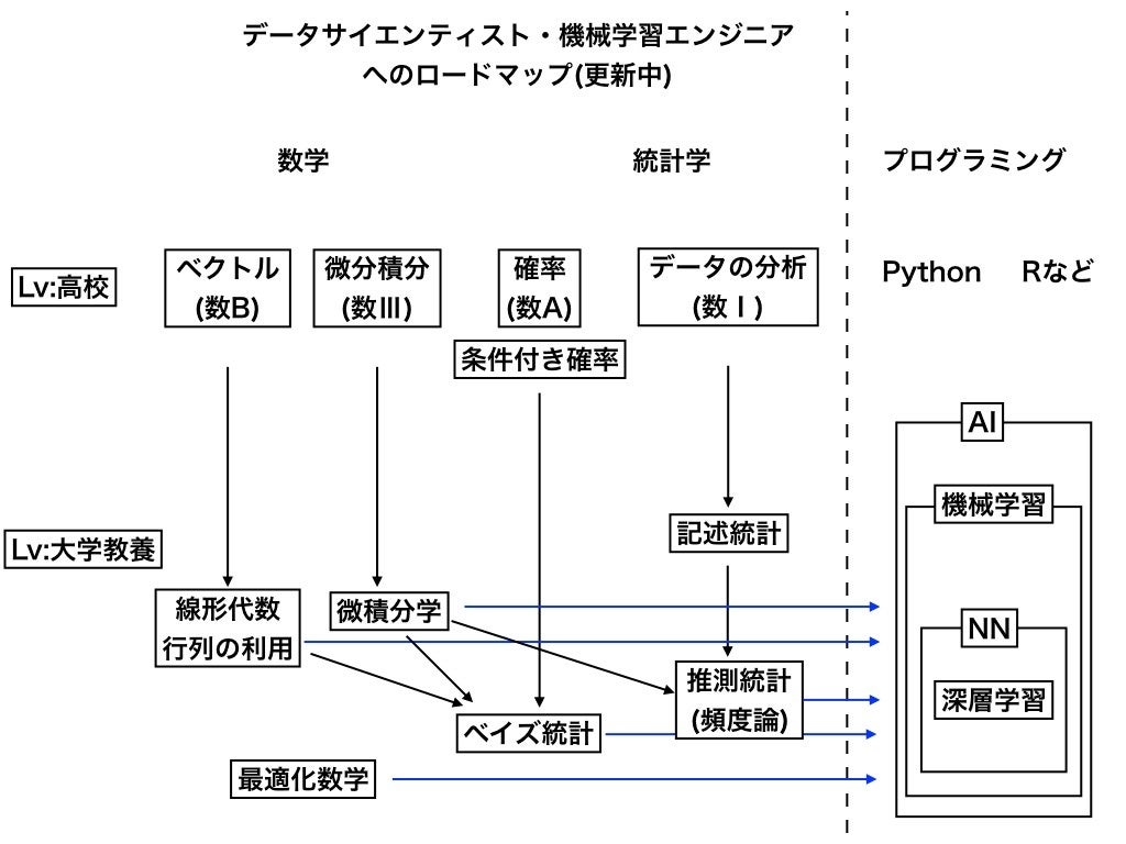 以下に簡単なフロー図を添付しております通り、高校課程での数学が次のような分野に繋がっていきます。