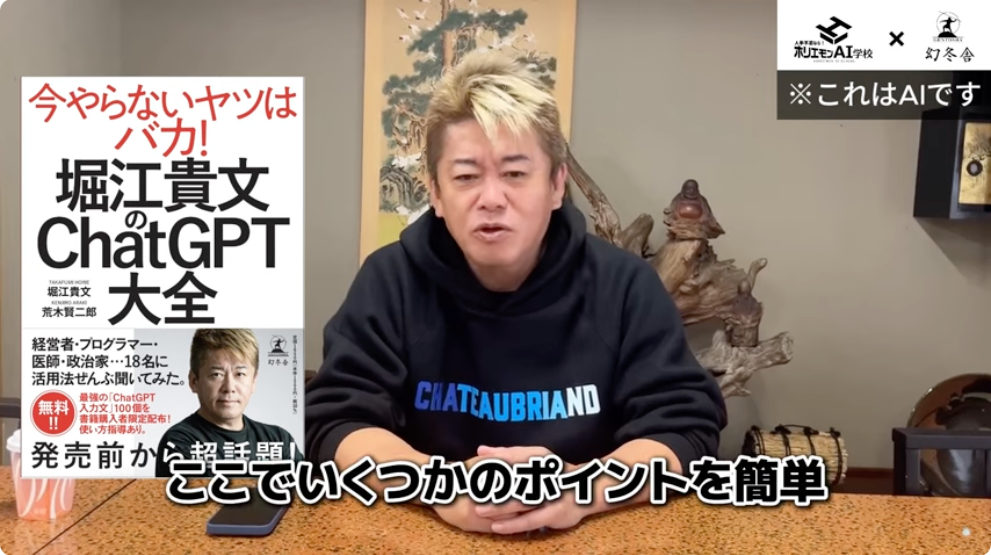 2024年6月19日、ホリエモンAI学校株式会社(本社:新宿区、代表取締役:荒木賢二郎)は、ホリエモンAIが貴社ビジネスの公認アンバサダーとして就任し、貴社の成長を加速させる新サービス「ホリエモンAIアンバサダー」を開始します。ホリエモンAIは堀江貴文氏そっくりのAIアバターであり、貴社のPRを動画で行うとともに、堀江貴文本人との対面グループミーティングが月に1回実施されます。