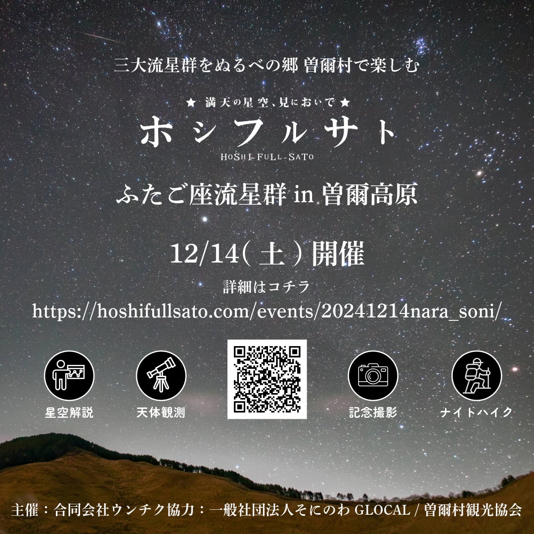 アストロツーリズムのイベント企画・運営を行っている合同会社ウンチク(本社:奈良県奈良市、代表社員:太田原 章巨)は、 2024年12月14日(土)に、奈良県曽爾村の曽爾高原にて三大流星群の一つ「ふたご座流星群」の星空イベントを開催いたします。