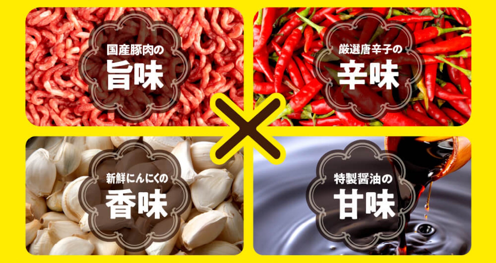 国産豚肉の粗挽き肉の「旨味」と新鮮ニンニクの「香味」、厳選唐辛子の「辛味」、特製醤油の「甘味」の四味一体の黄金比率で仕上げています。