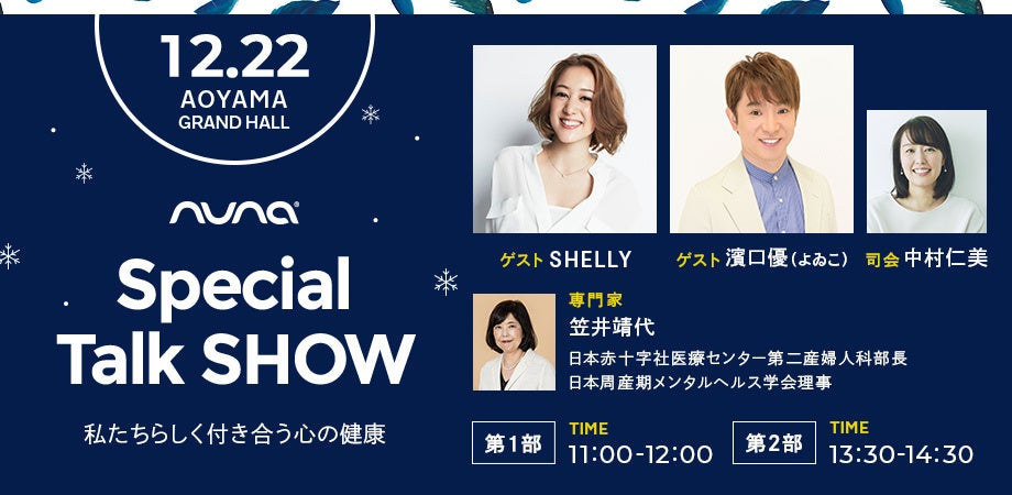 ベビー用品ブランド「nuna(ヌナ)」が、子育てや家族の生活に寄り添い、学びや癒し、楽しさを提供するワークショップ「nuna Family Lounge Workshop」第三回の取り組みです。このたび、ベビー用品ブランド「nuna(ヌナ)」では、妊娠中のご夫婦や、育児に励むお母さんお父さん向けに、12月22日(日)、青山グランドホールで、「私たちらしく付き合う心の健康」をテーマに、タレントのSHELLYさん お笑いタレントの濱口優さん、産婦人科医の笠井靖代さんをお招きして、トークショーを開催します。司会にはフリーアナウンサーの中村仁美さんをお迎えします。産前産後、自分自身・それを取り巻く環境、たくさんのことが変化する中で、私と私たちに合った方法で、私と私たちができる方法で、どうやって心の健康に付き合っていくのか。一つの答えを導き出すのではなく、それぞれの“私たちらしい”心の健康との付き合い方に気づくきっかけになるワークショップです。