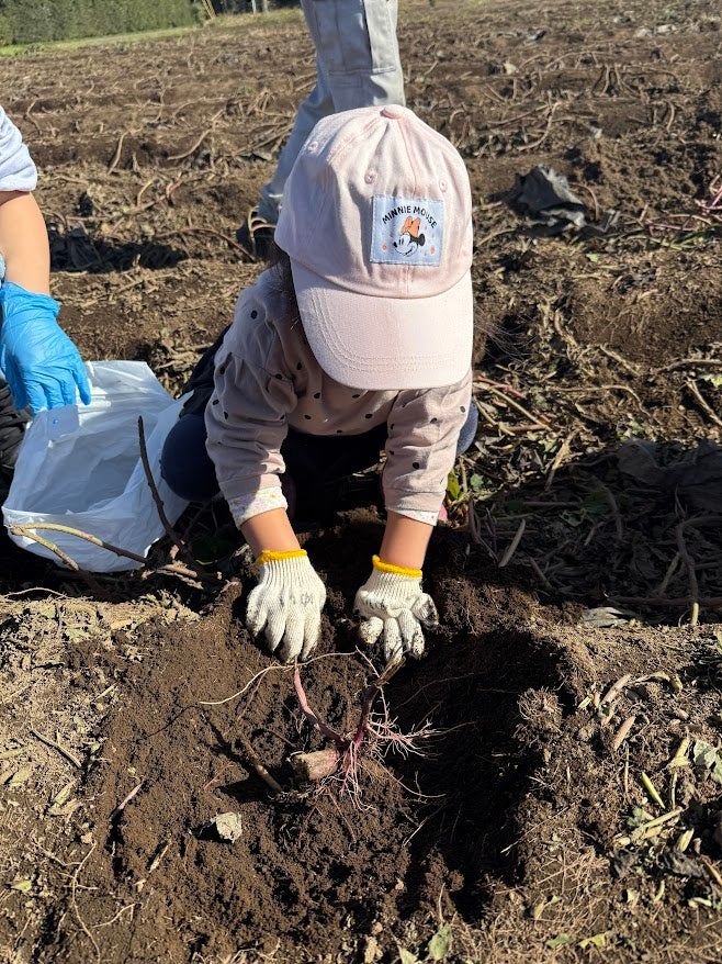 芋掘り会場は近隣の農家さんにご協力いただきました。小さなお子様でも掘りやすいように、ツルを切った状態で参加出来る様にご用意。それでも掘り出すのにはコツがいる様で、中には尻もちをついているお子さんもいて、和やかな雰囲気のもと、体験をしていただきました。